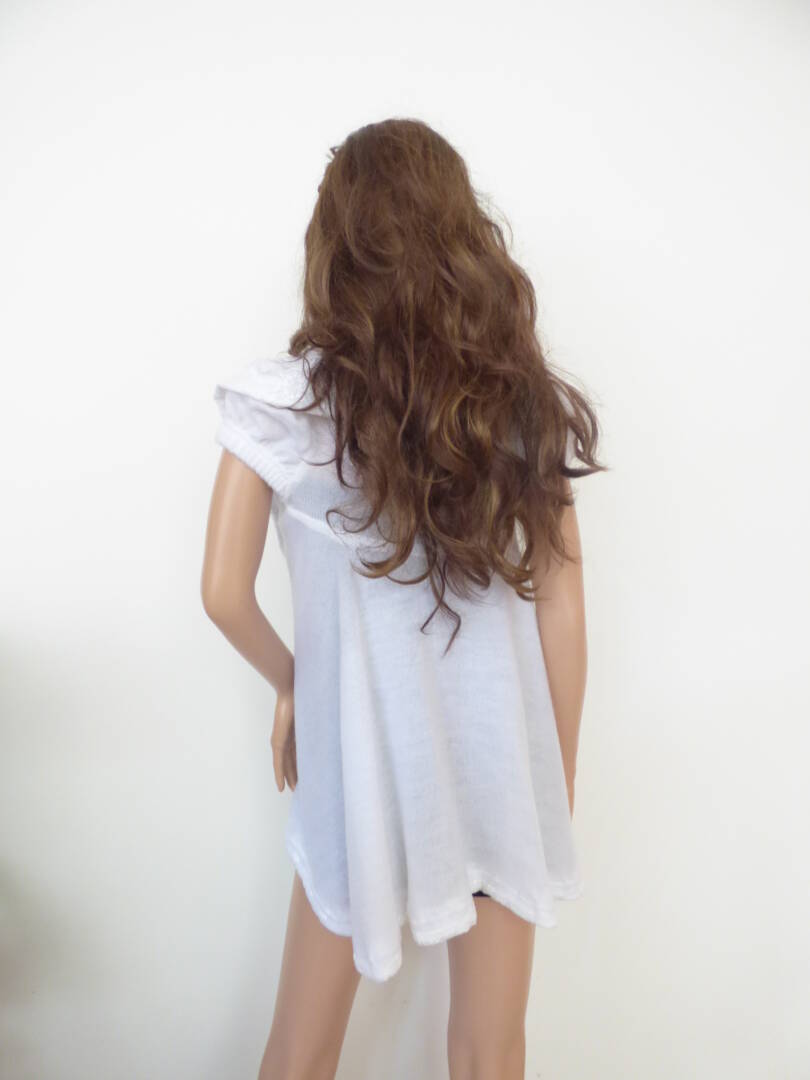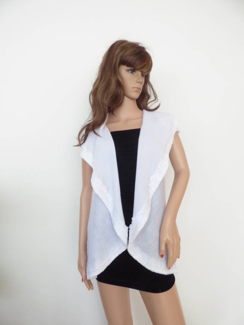 Бяла жилетка с къс буфан ръкав, модела е размер XS