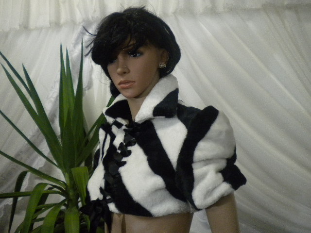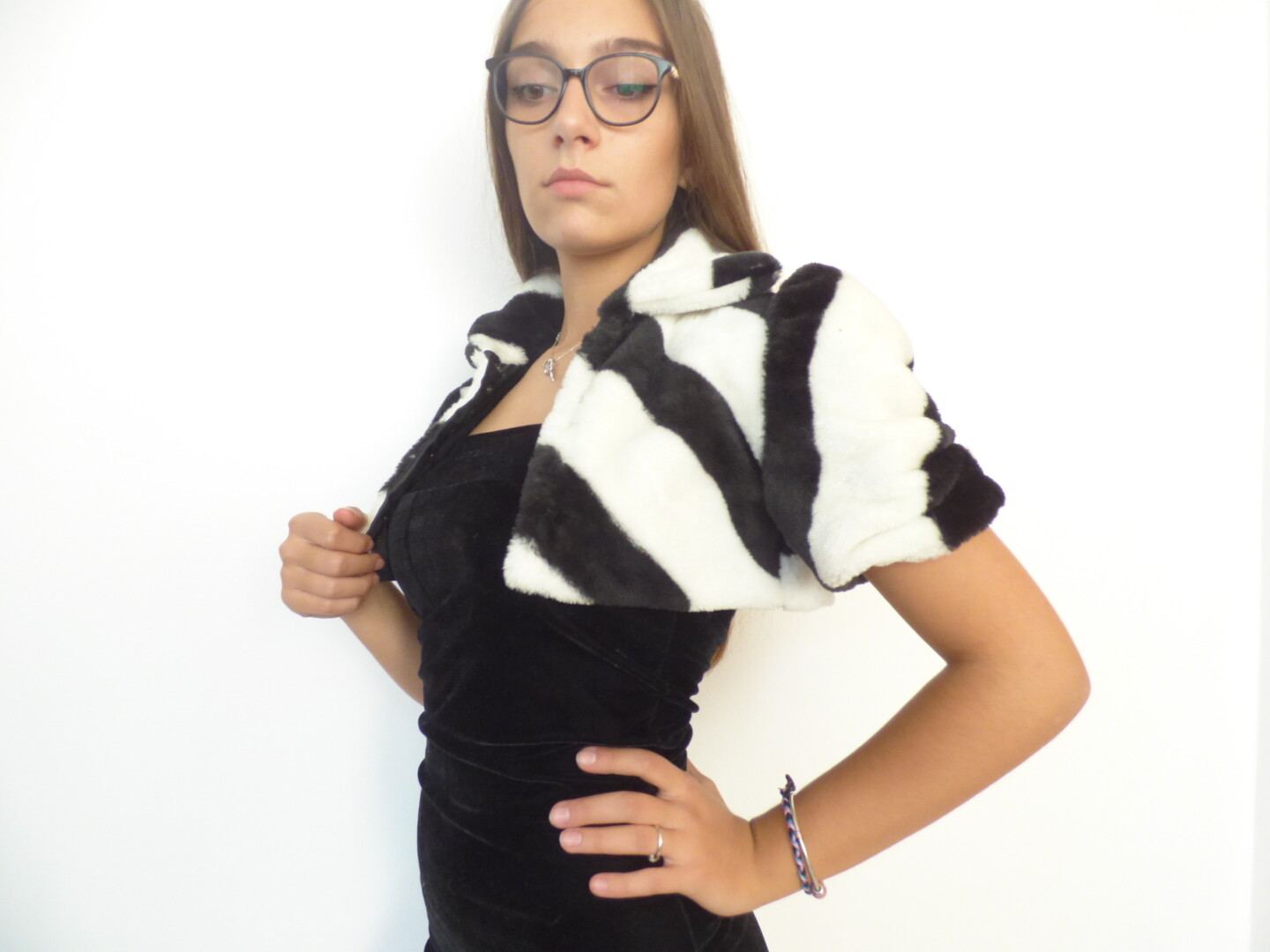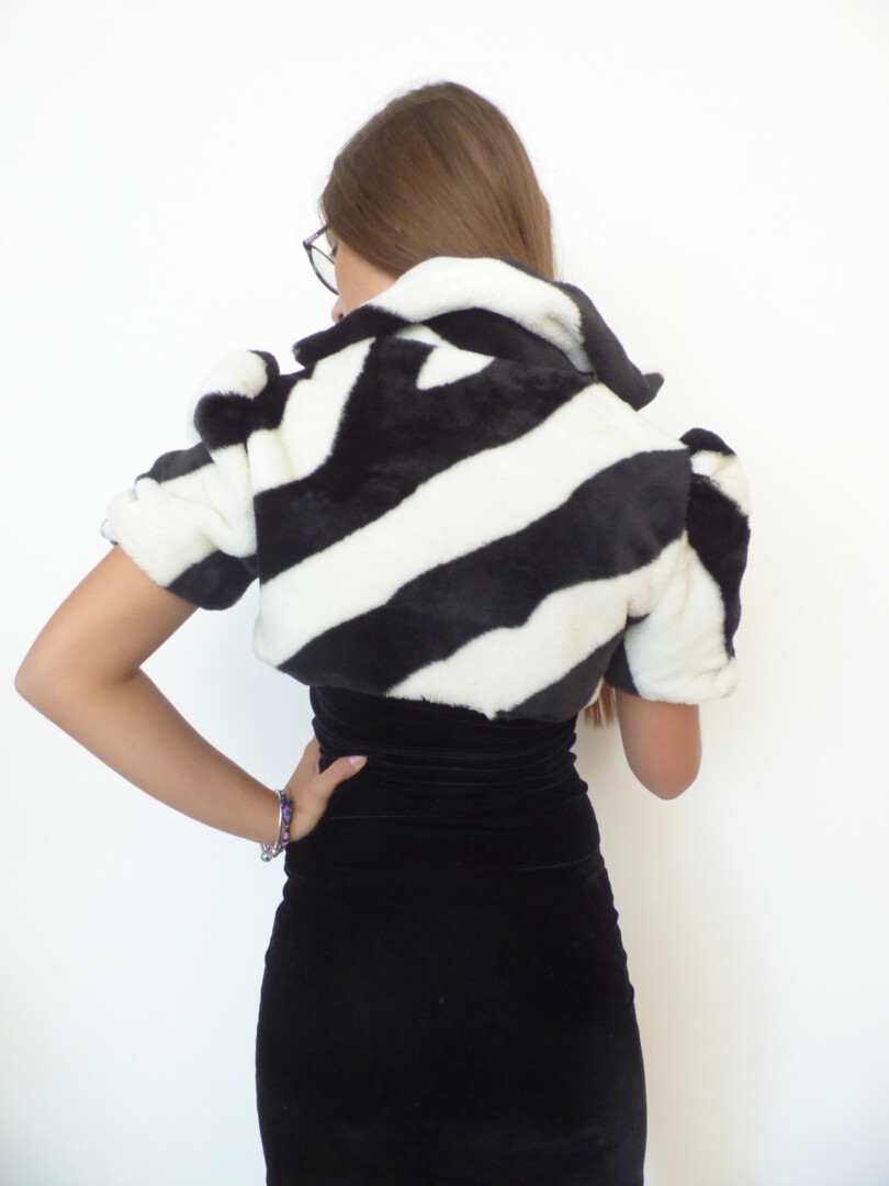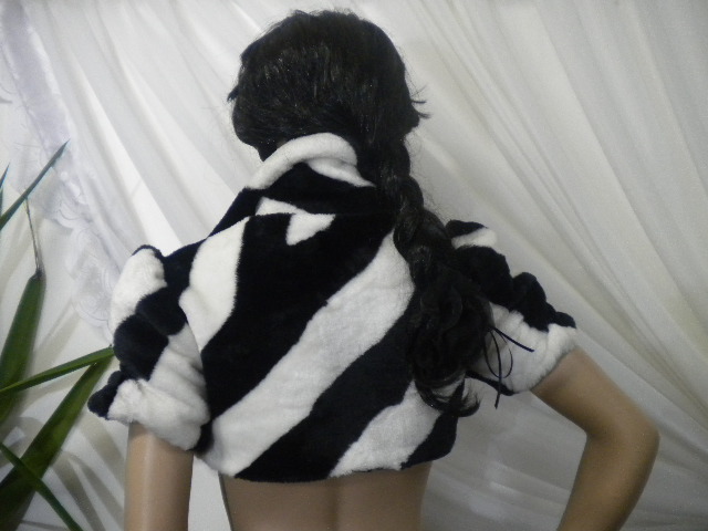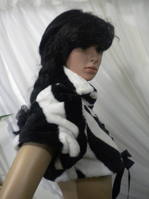 Елегантно дамско черно бяло пухкаво болеро с къс буфан ръкав.