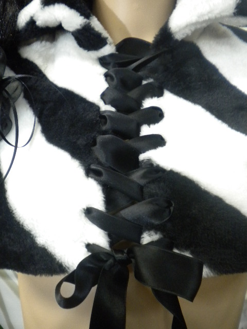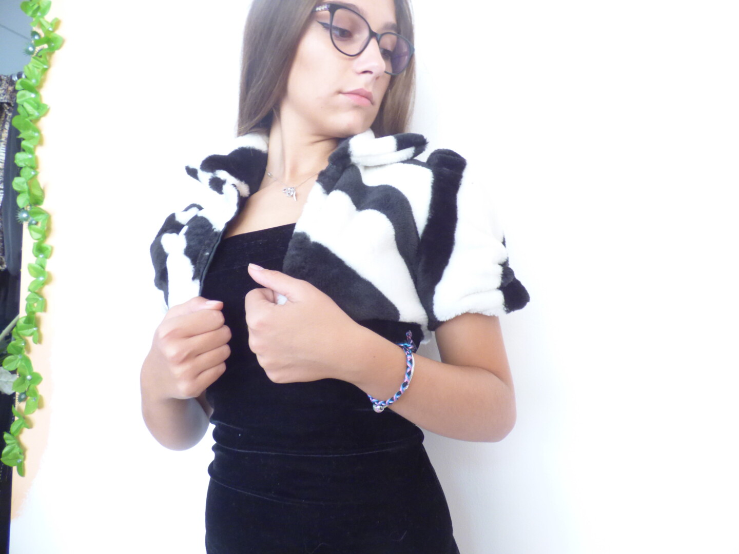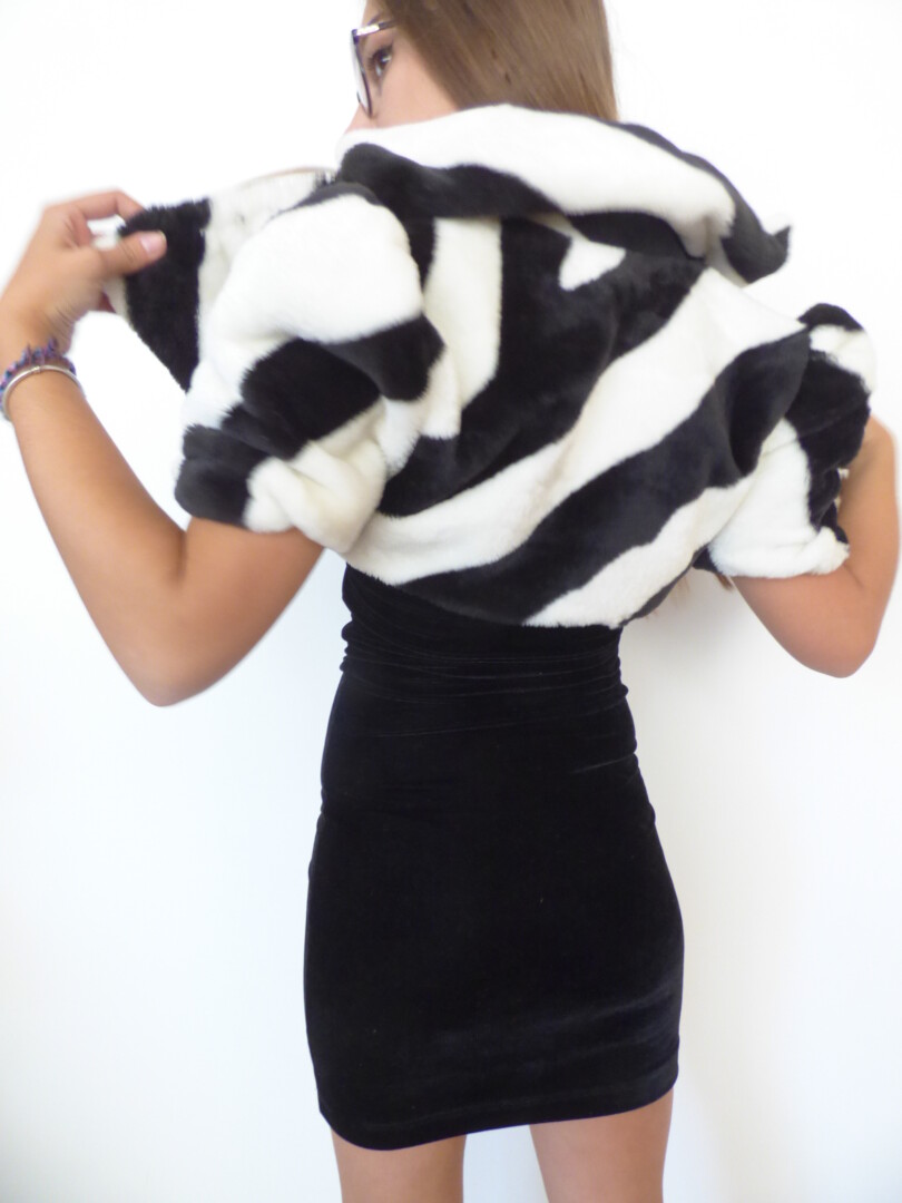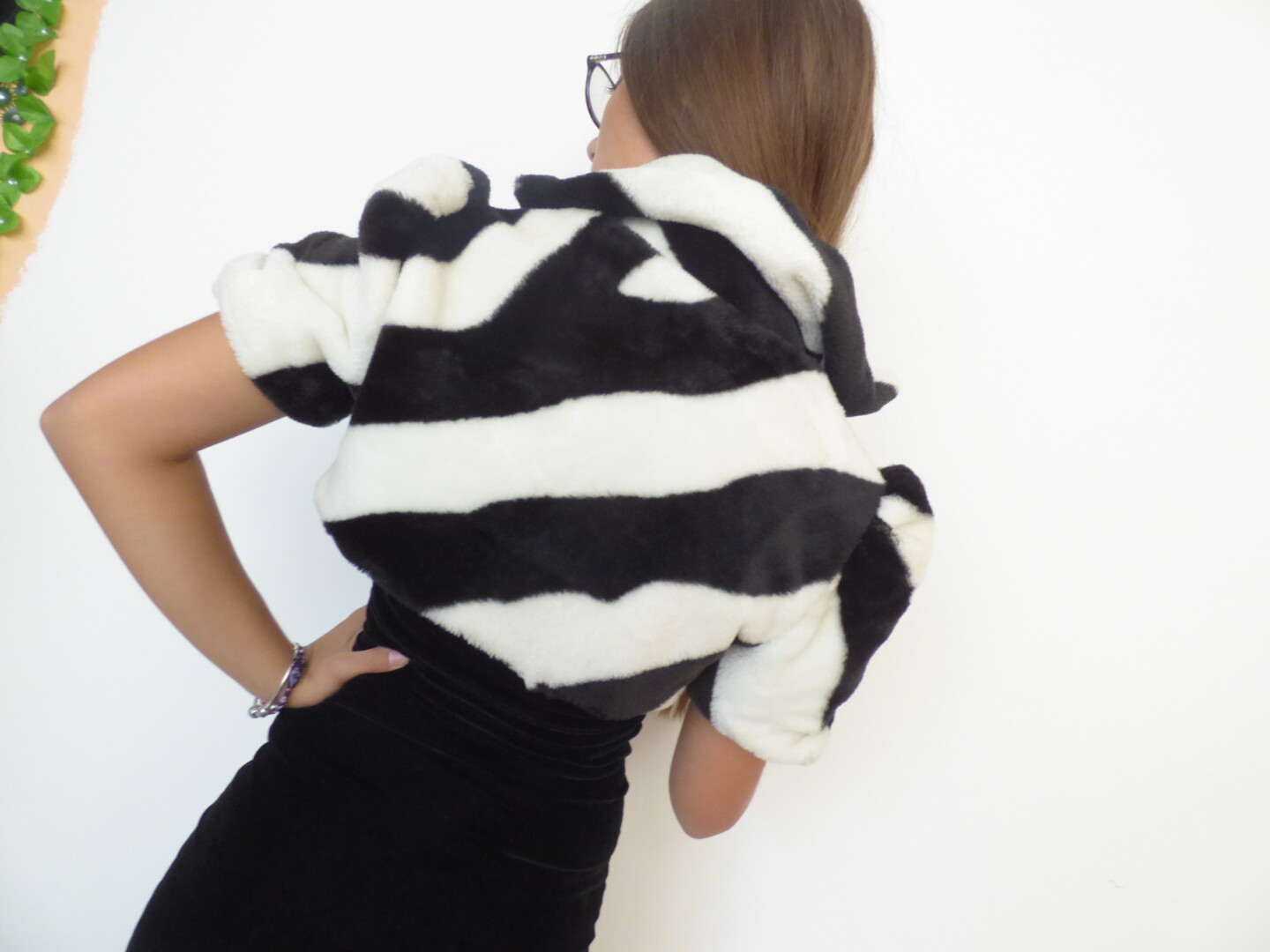 Елегантно дамско черно бяло пухкаво болеро с къс буфан ръкав.
