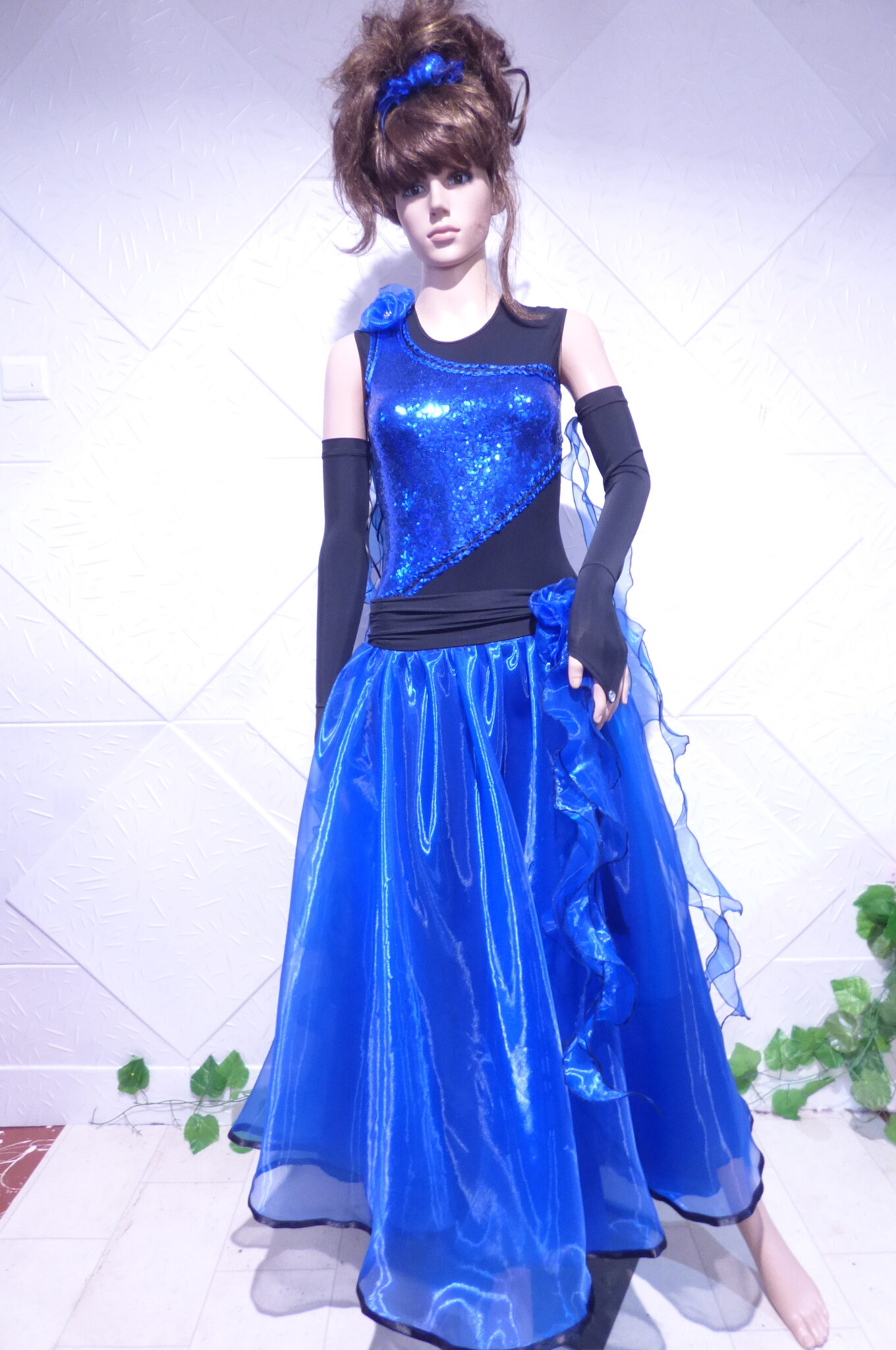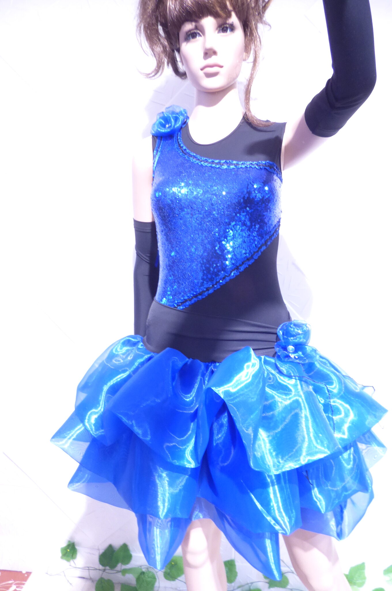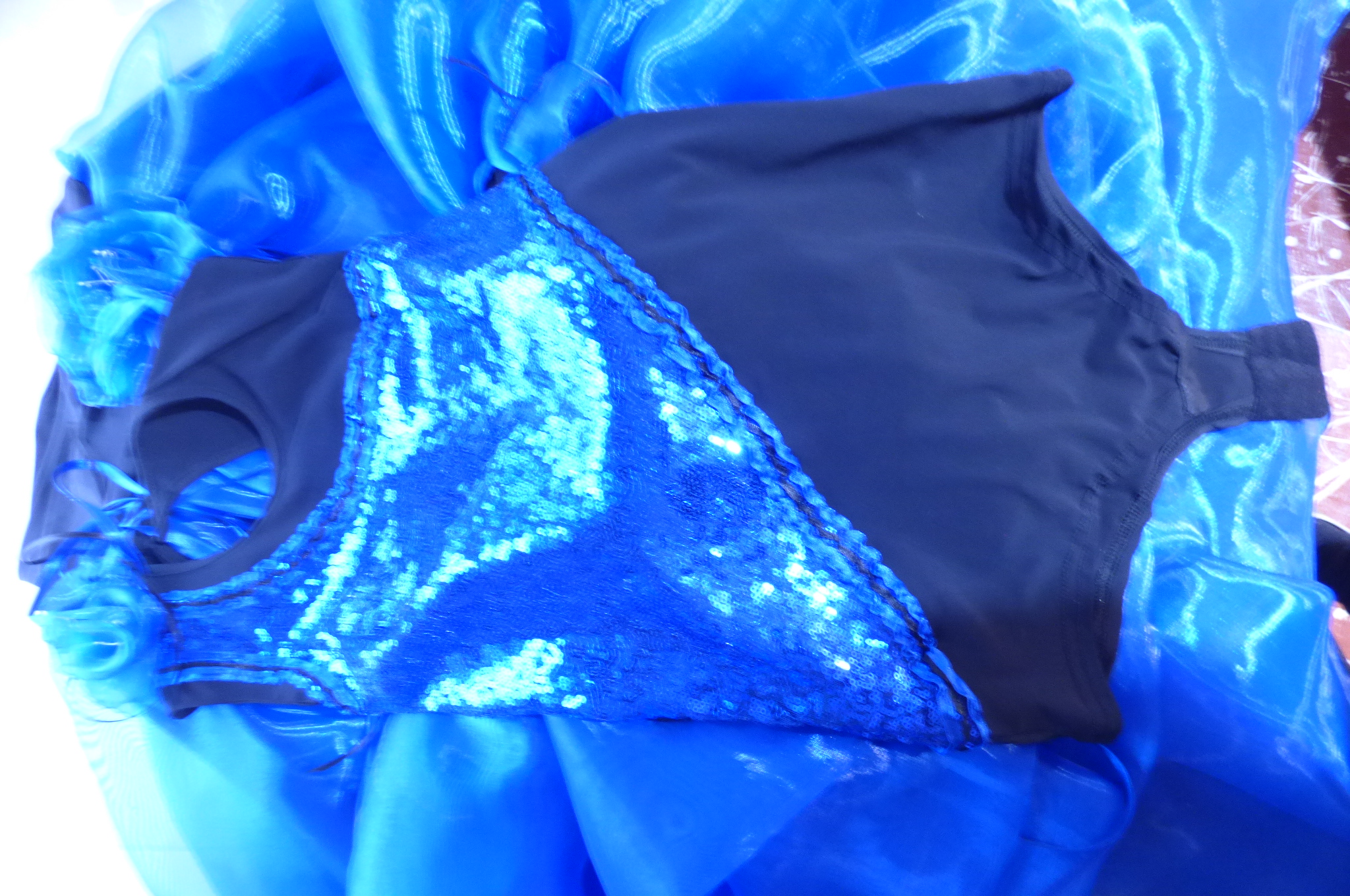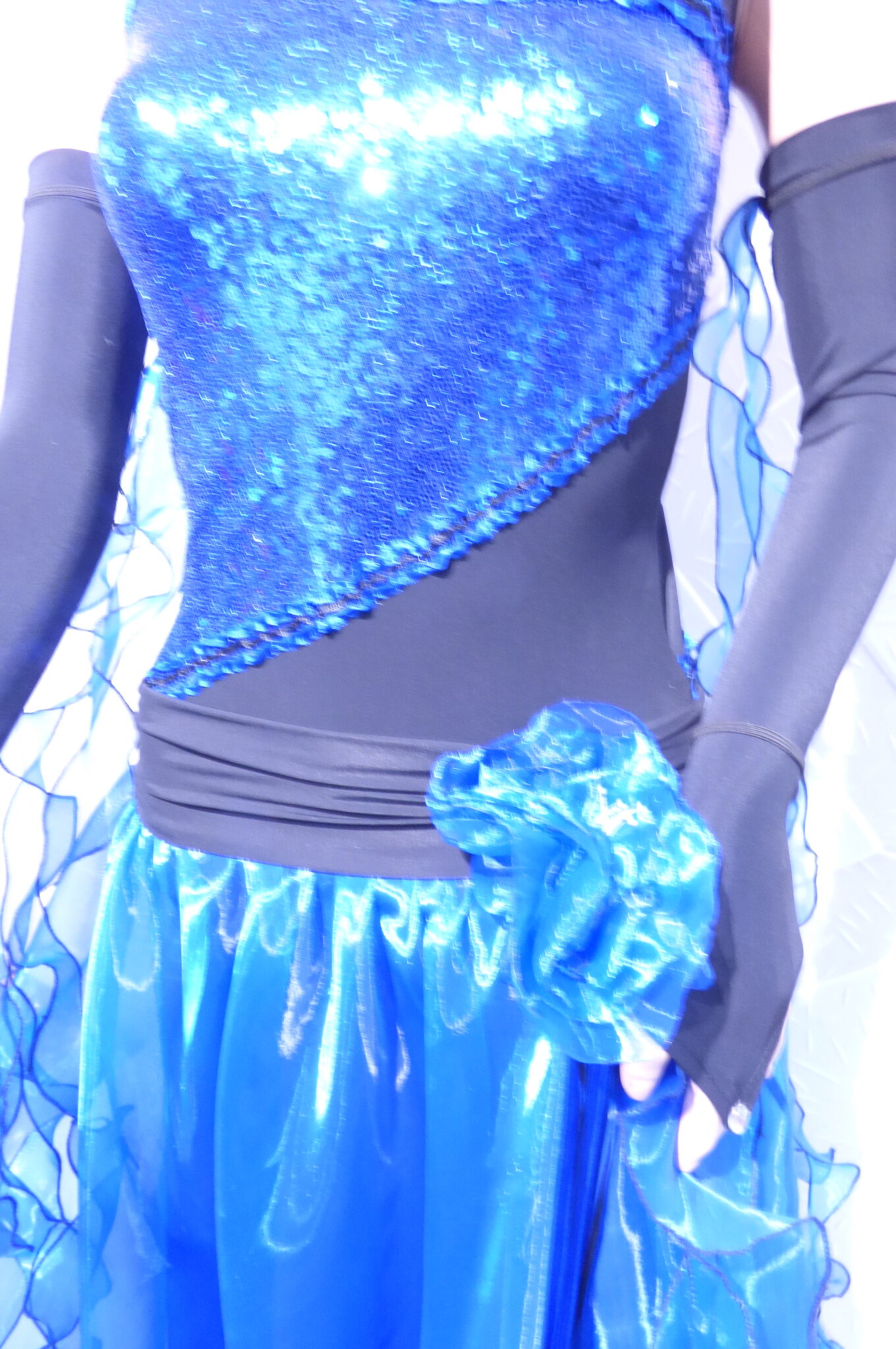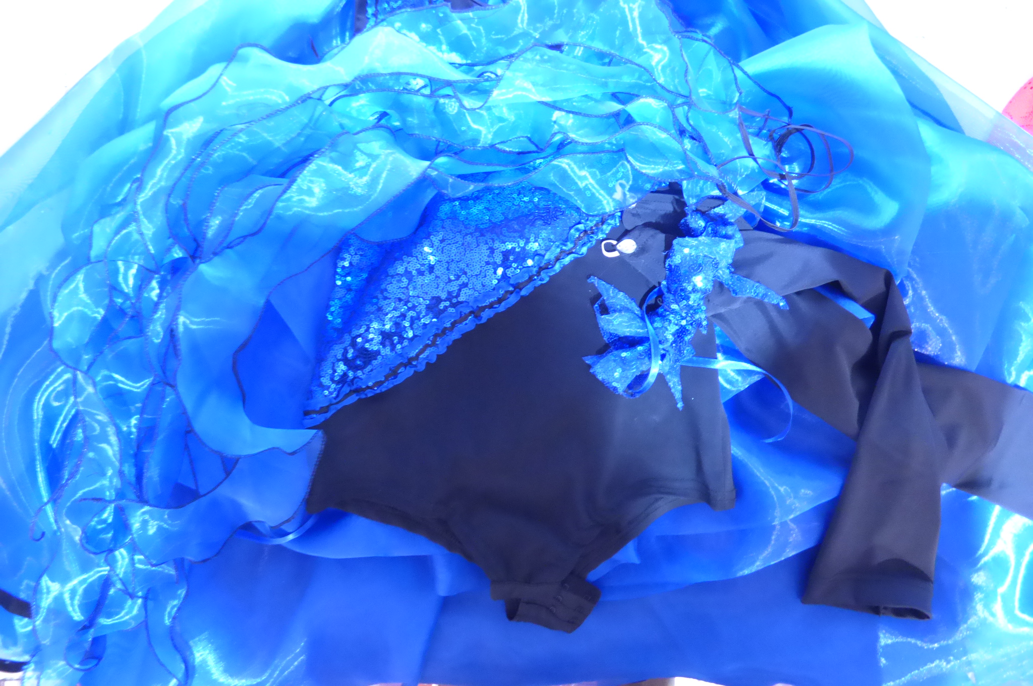 Боди с две поли -стандарт и латина,изработена от ликра ,органза, текстил с паети , сатенени панделки.