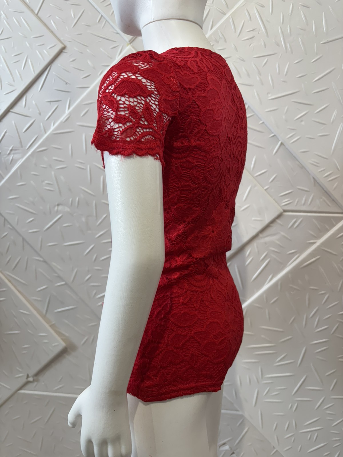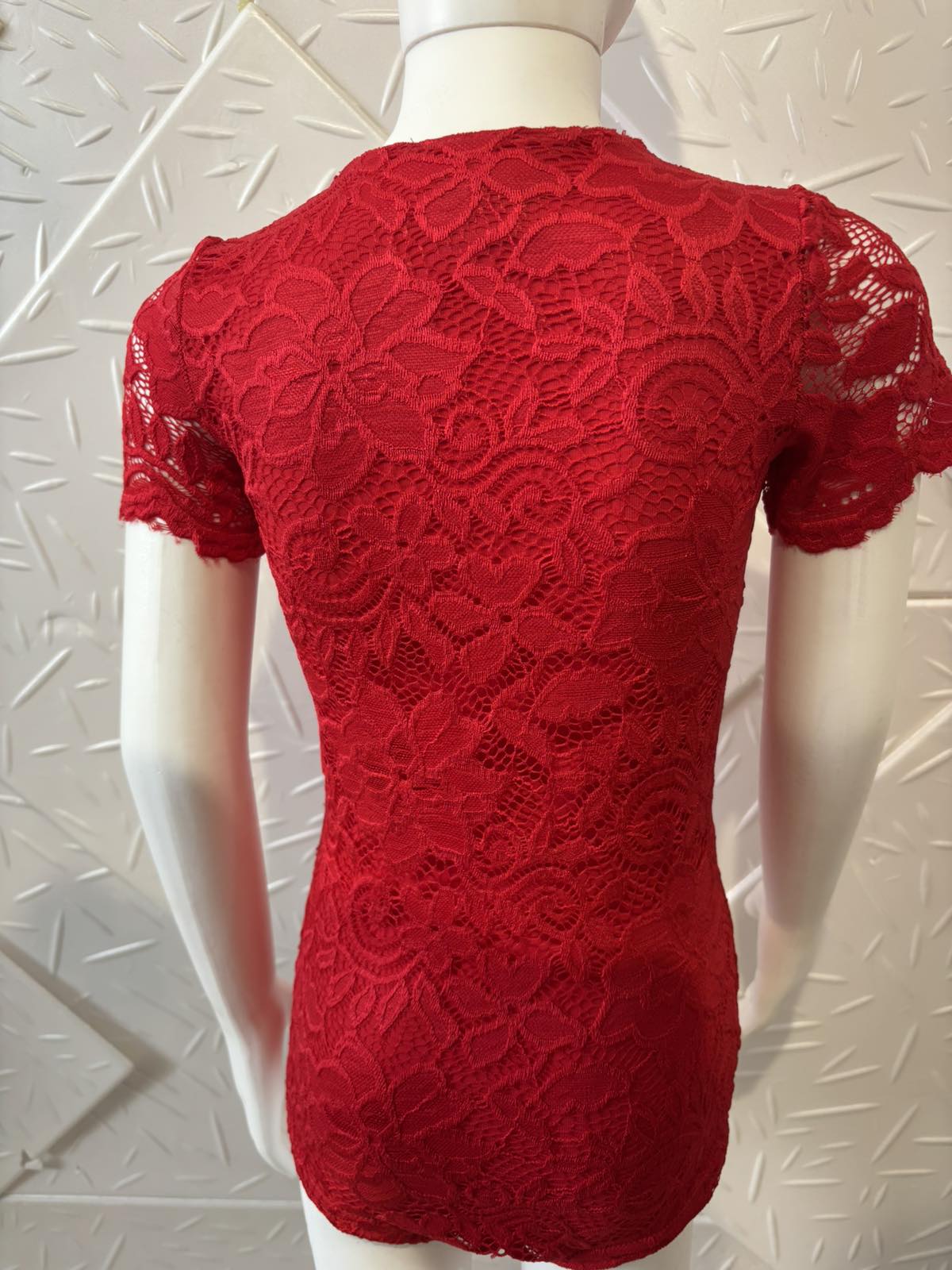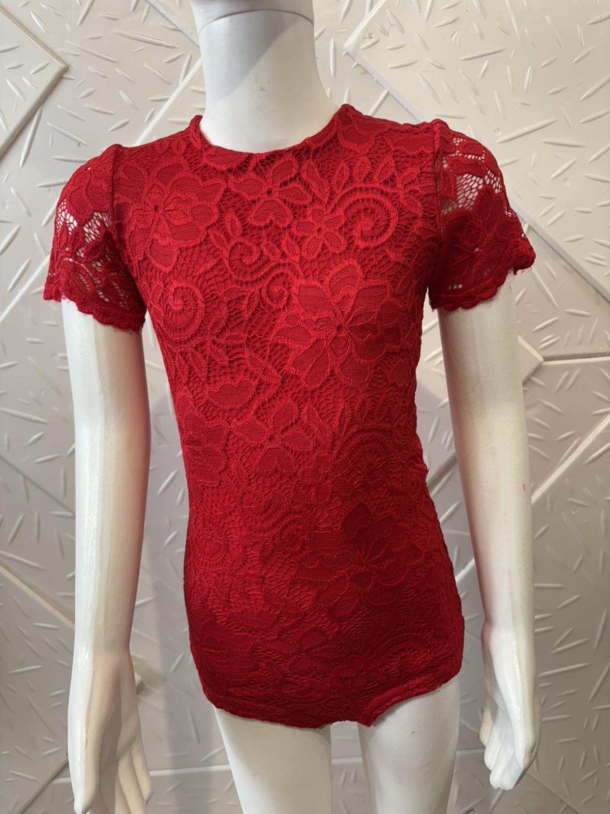 Червено детско боди за спортни танци с дантела , бодито може да е с закопчаване отдолу  ако детето го дразни може и без , ръкавчетата  също може да бъдат – дълги, три четвърти и къси.