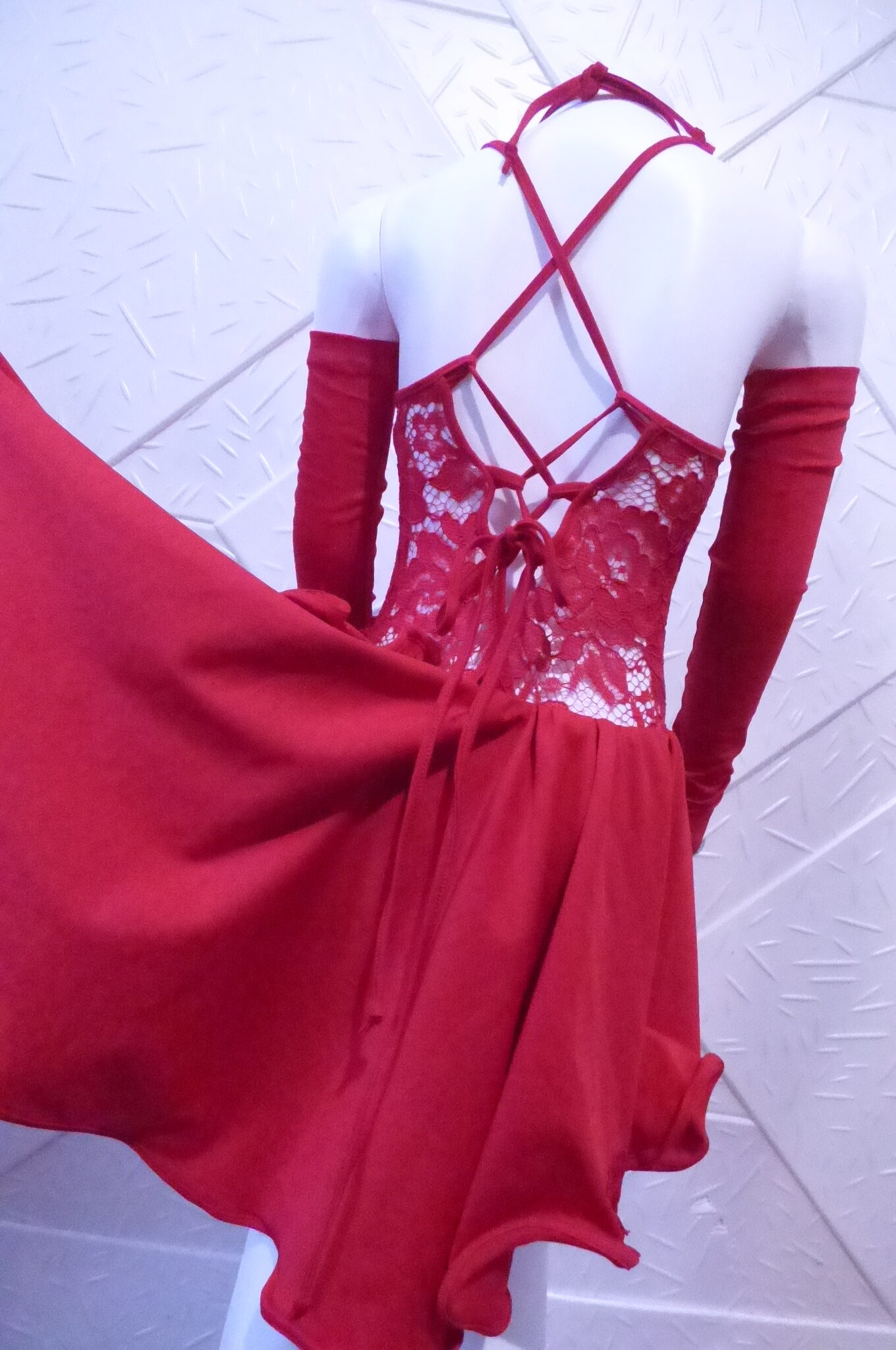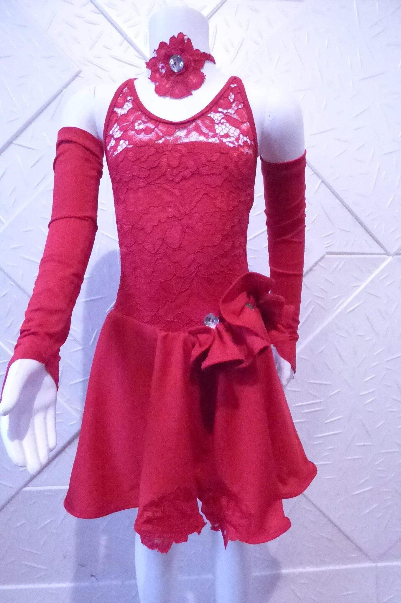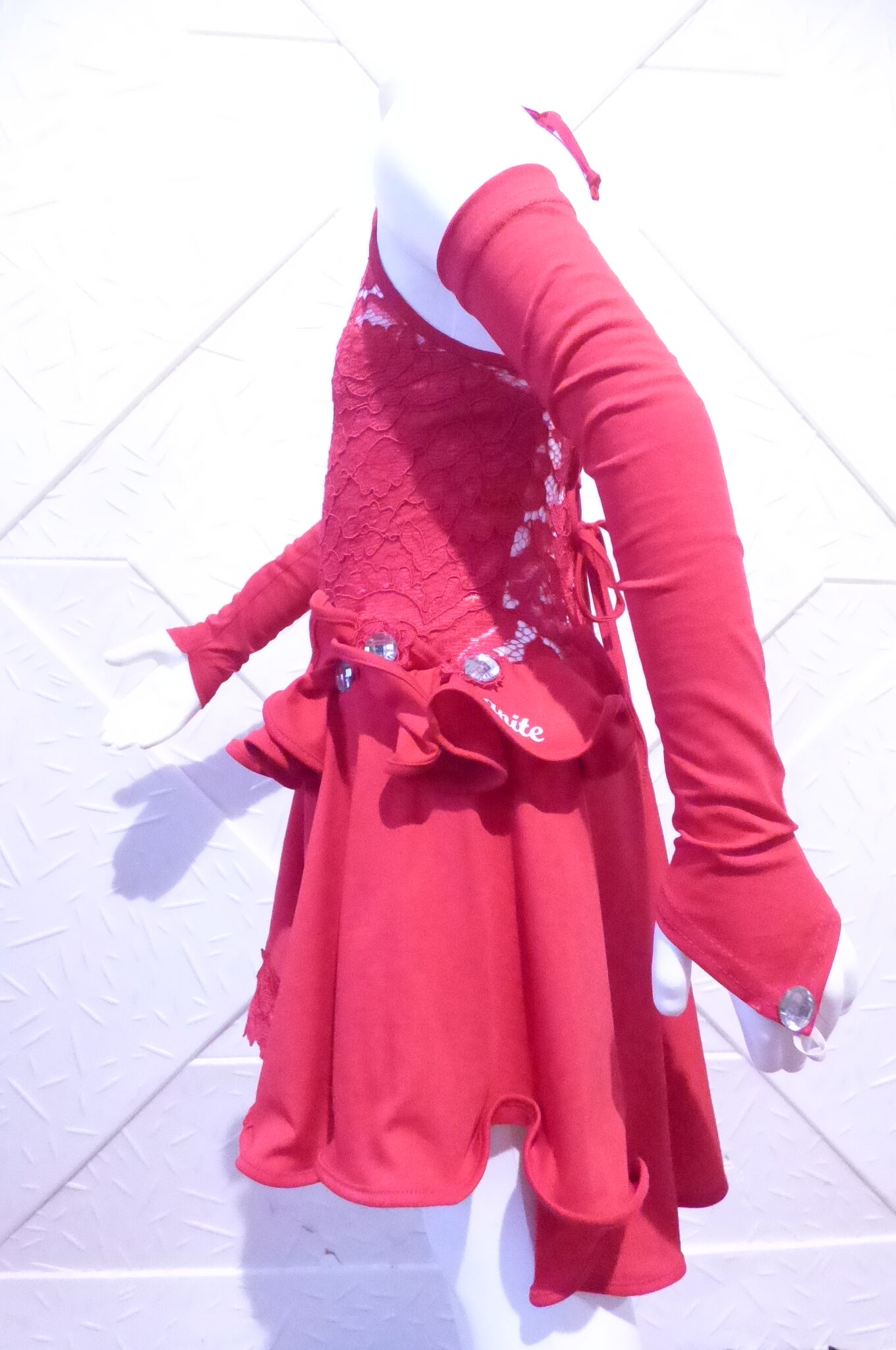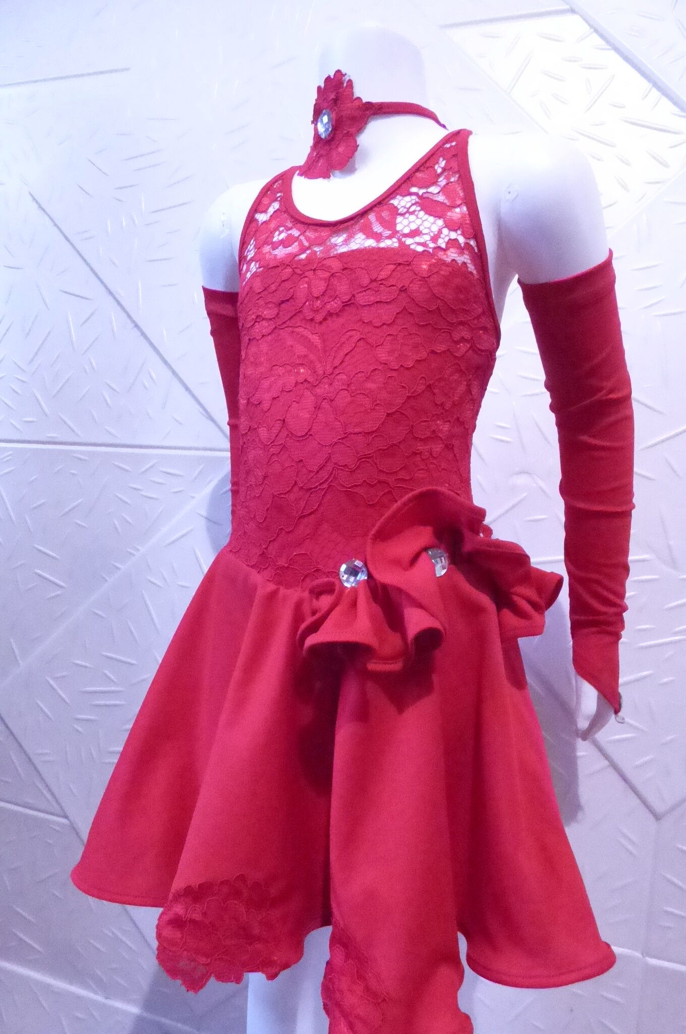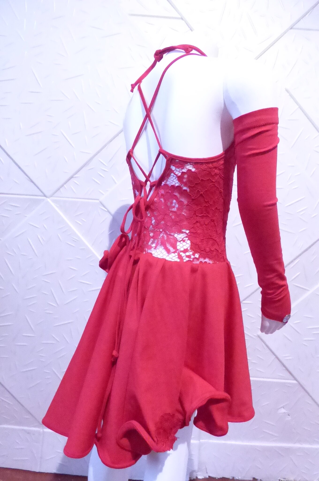 Детска рокля за спортни танци в червен цвят и гол гръб, изработена от памук с еластан, дантела.