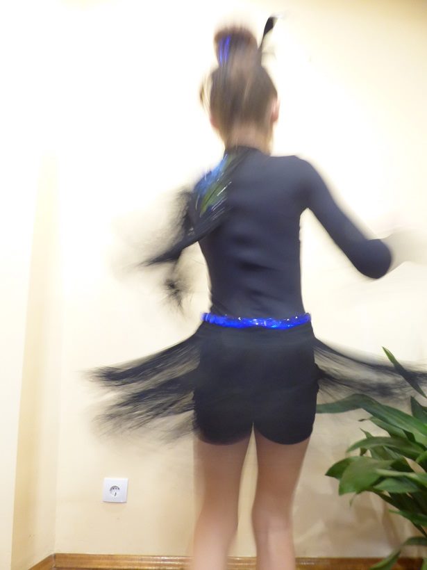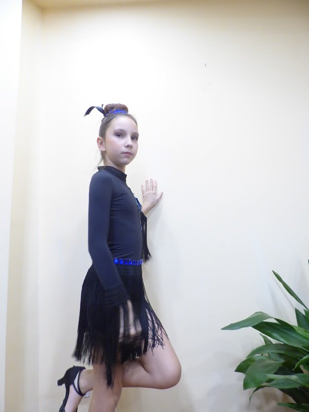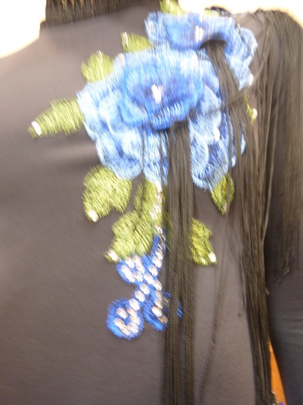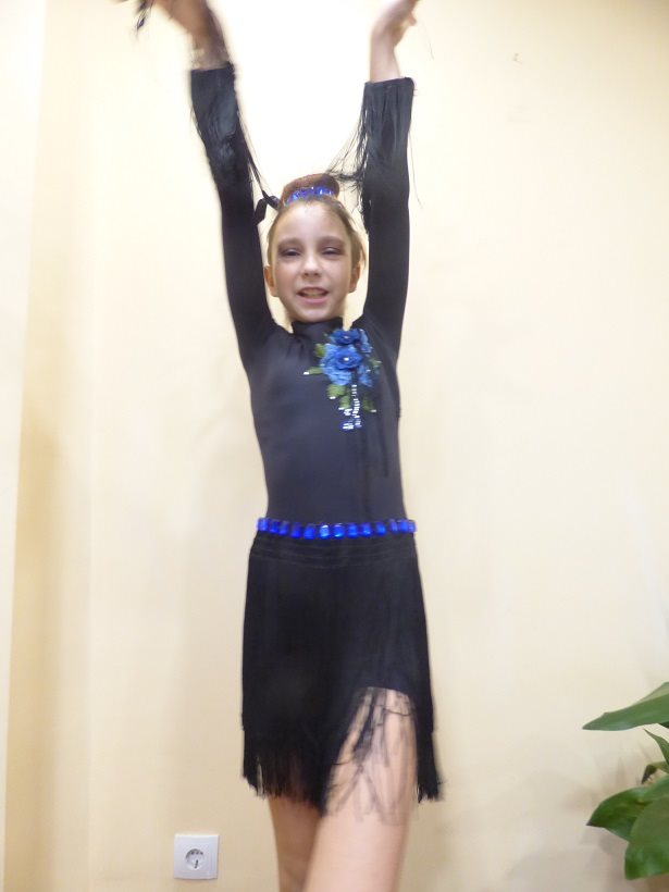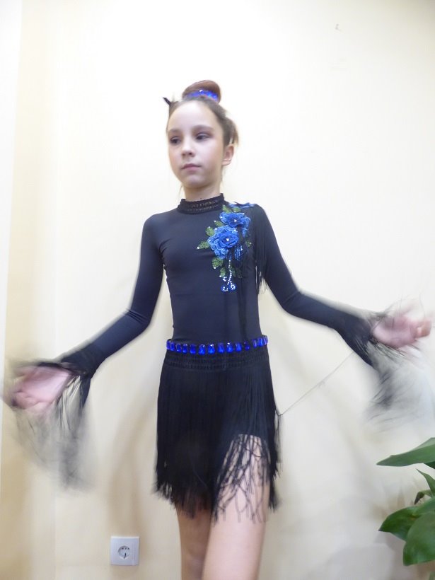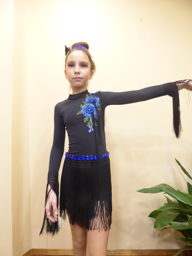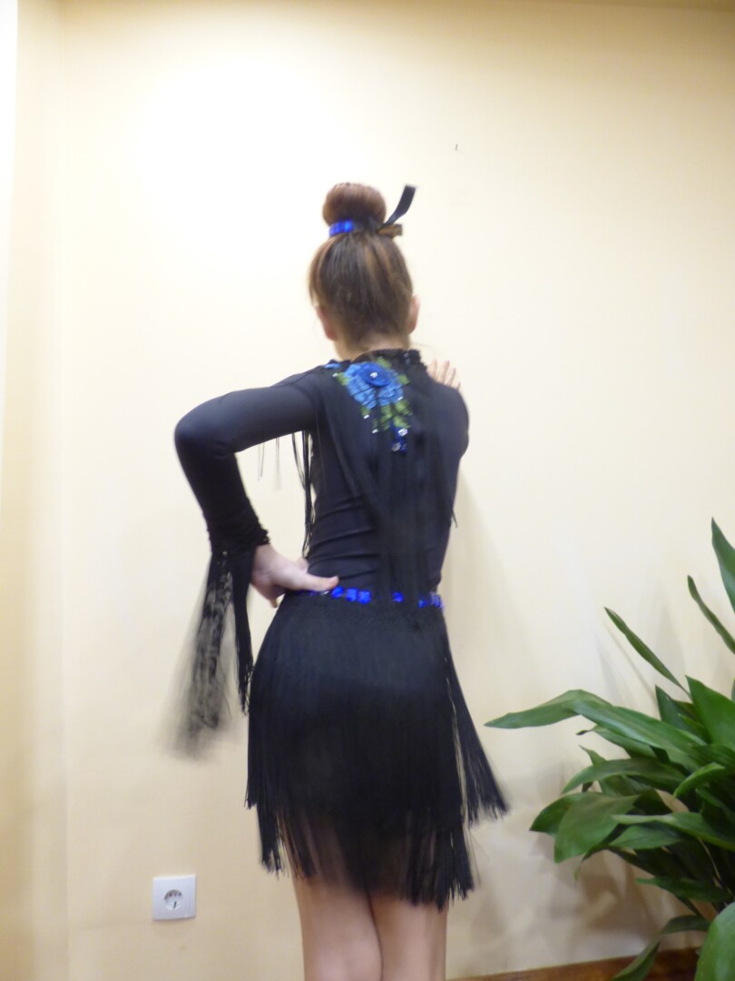 Детска рокля за спортни танци с ресни и цвете в черен и син цвят.