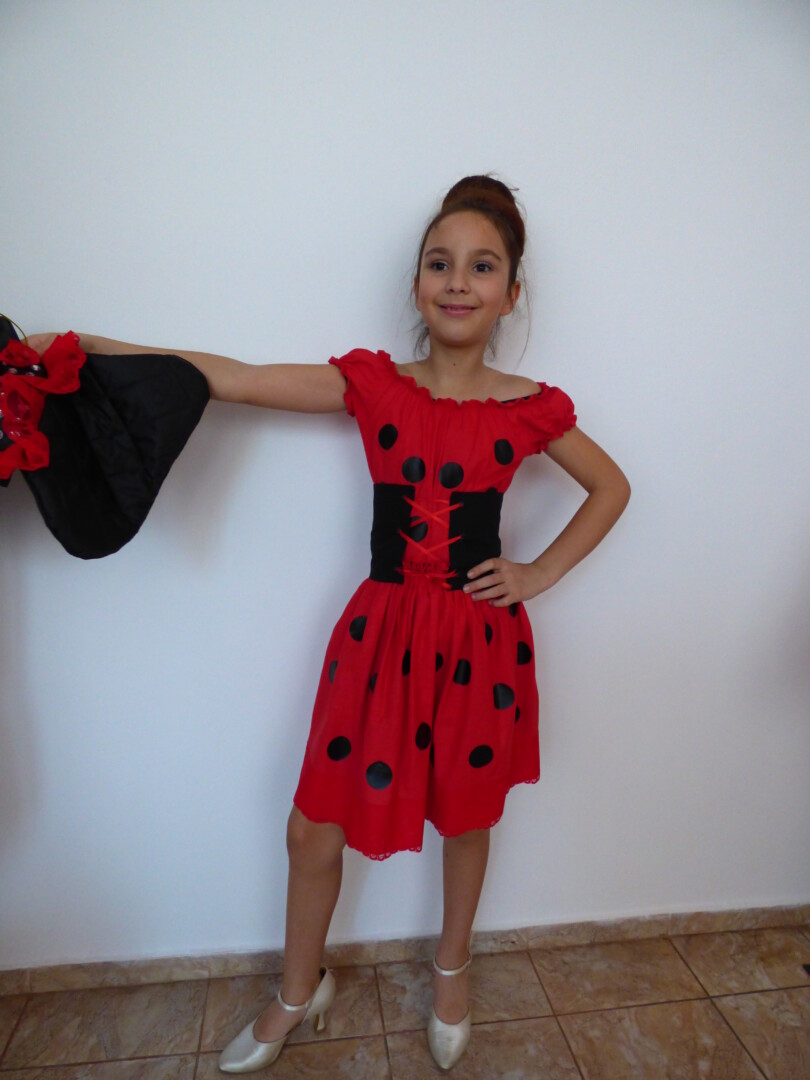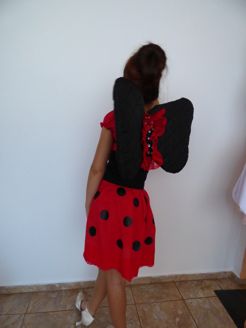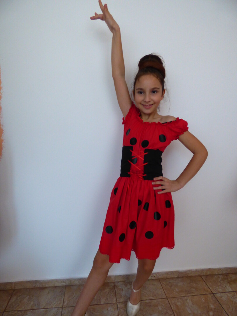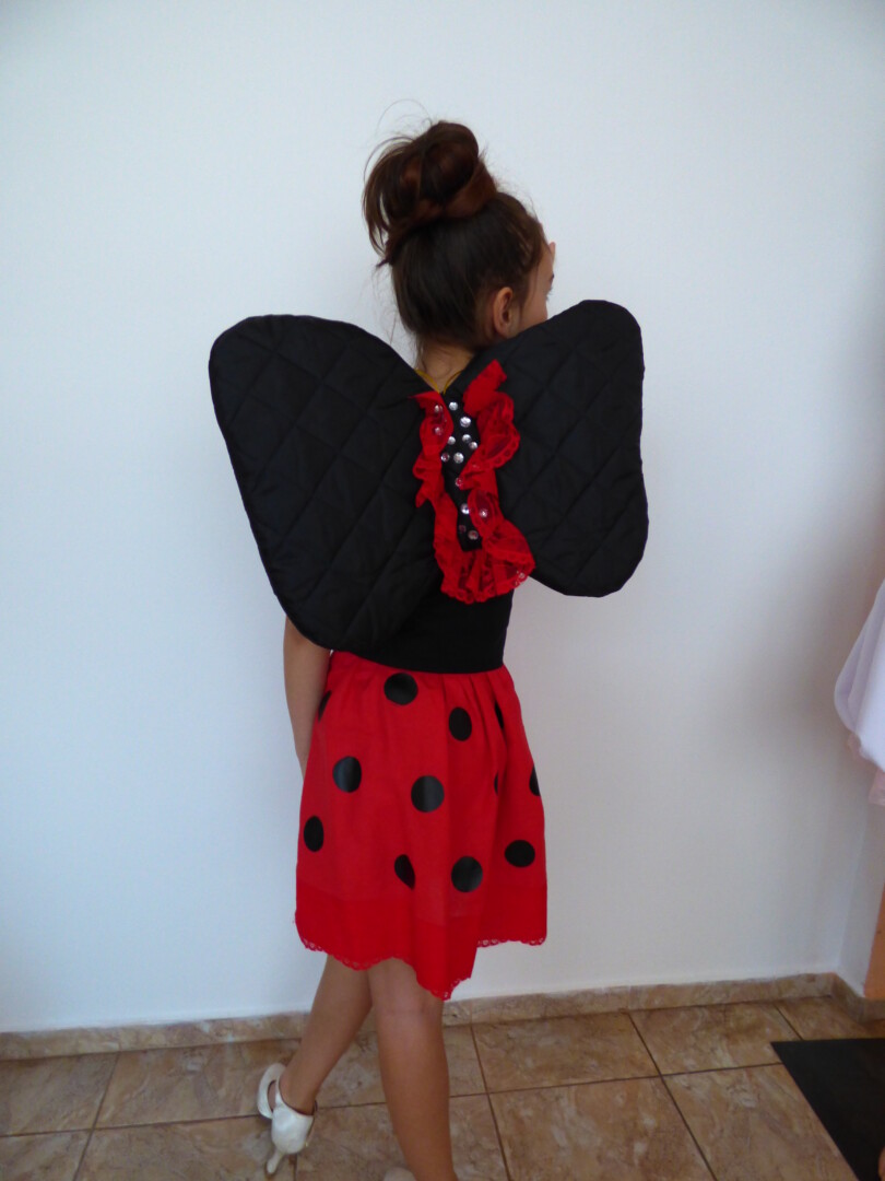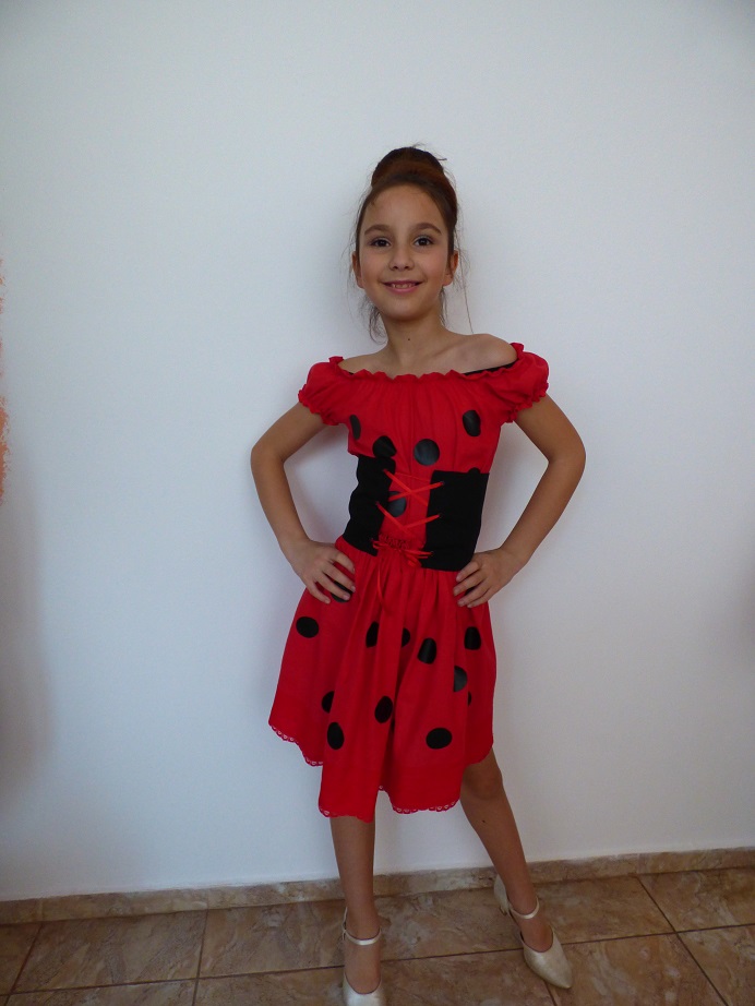 изработен от червен 100%памук с черни точки -сито печат, черен текстил, и вата.