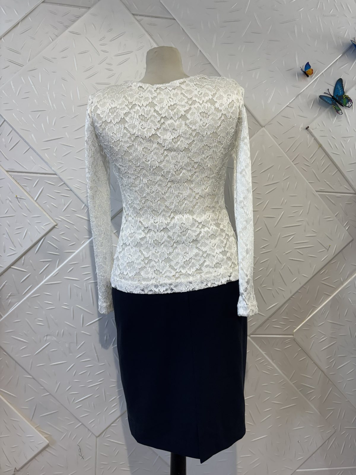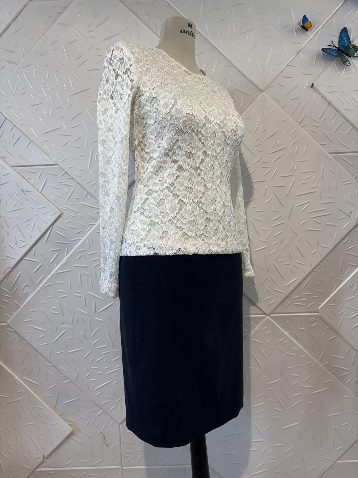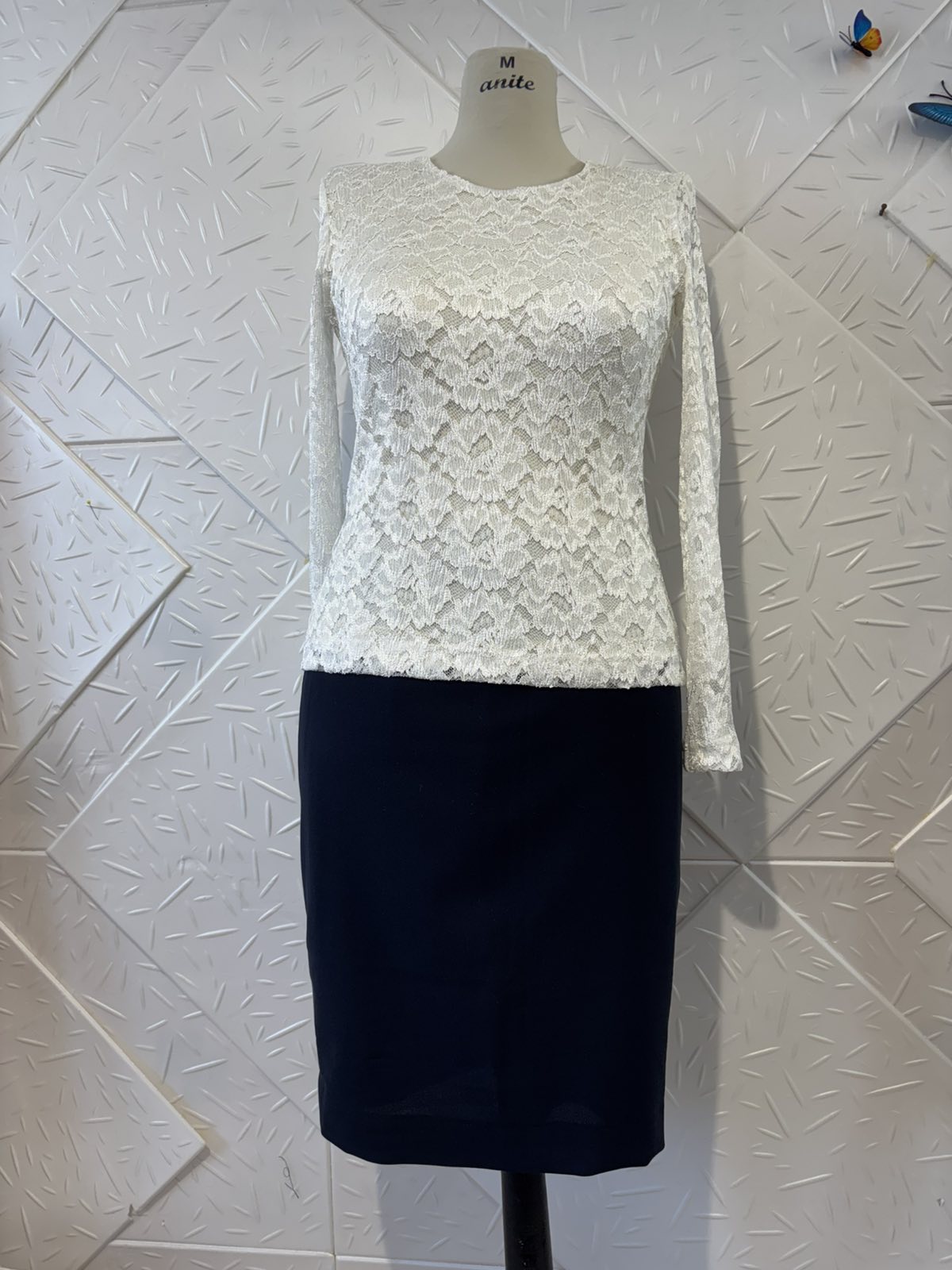 Елегантна дамска униформа- права тъмно синя пола с цепка отзад ,скрит цип, хастар и блуза от еластична дантела в екрю с хастар от полиами ,модела е подходящ за по слаба и по пълна фигура.