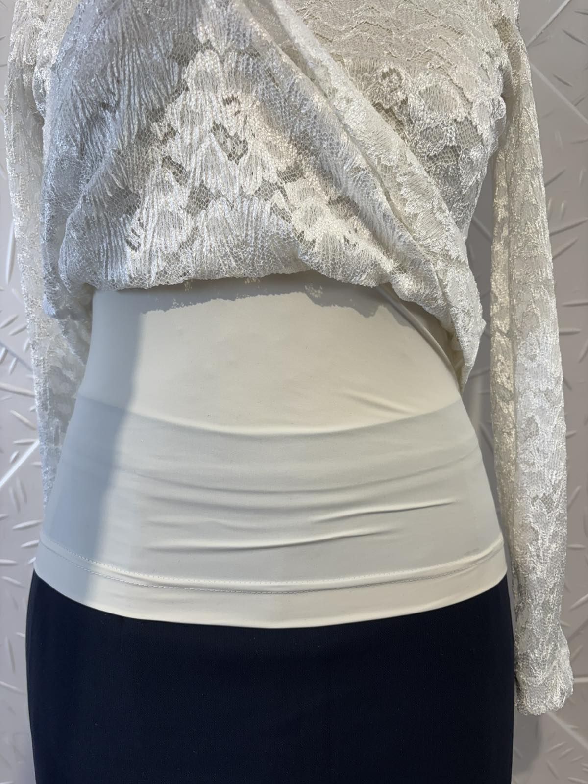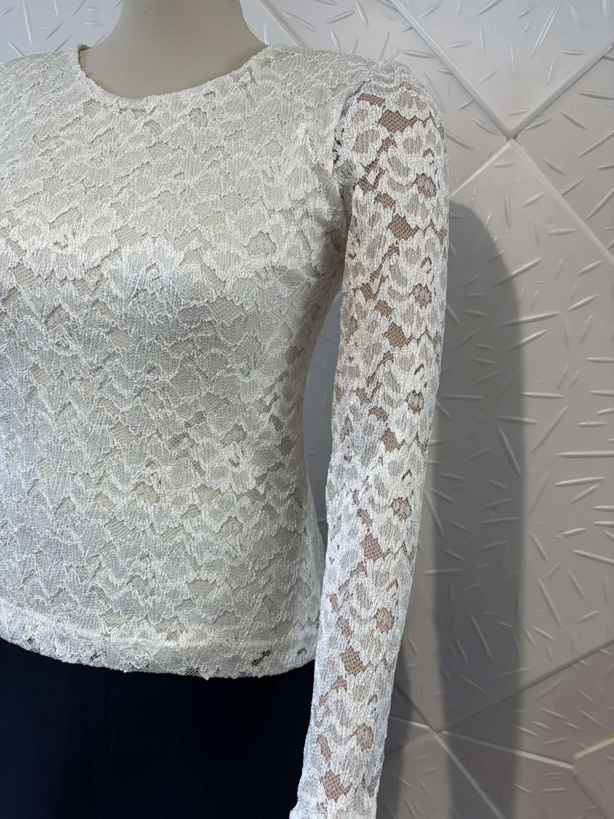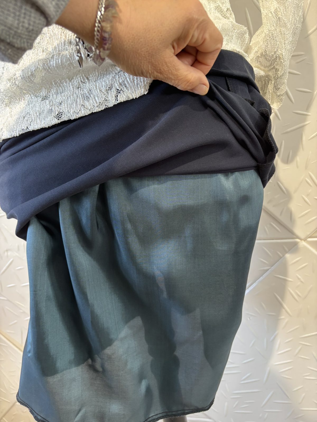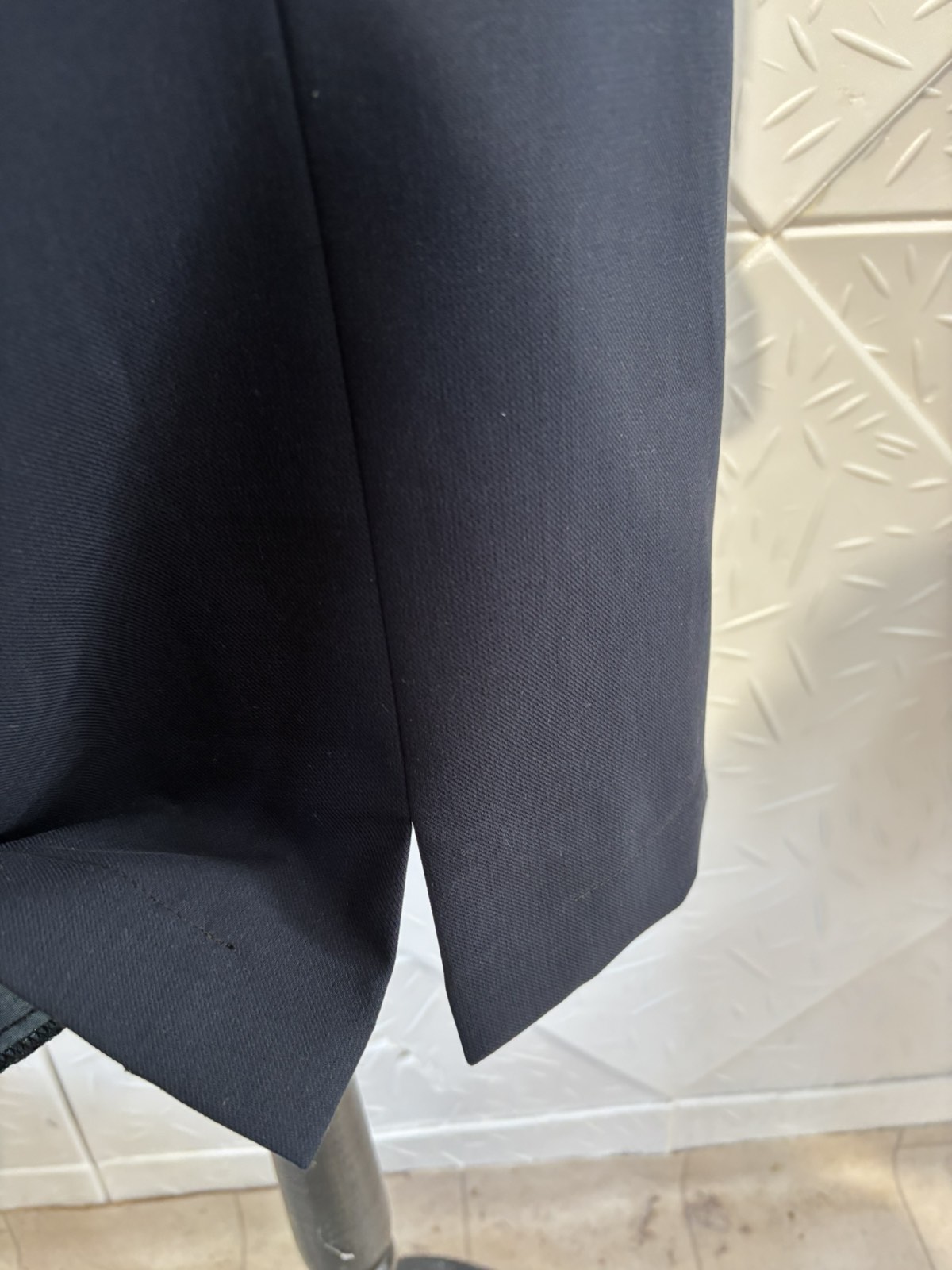 Елегантна дамска униформа- права тъмно синя пола с цепка отзад ,скрит цип, хастар и блуза от еластична дантела в екрю с хастар от полиами ,модела е подходящ за по слаба и по пълна фигура.