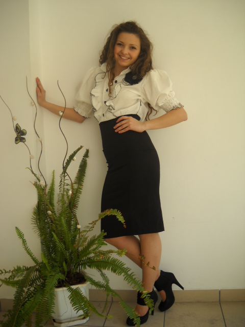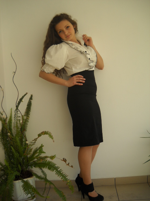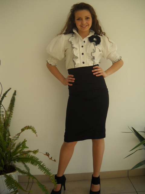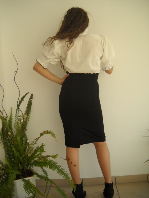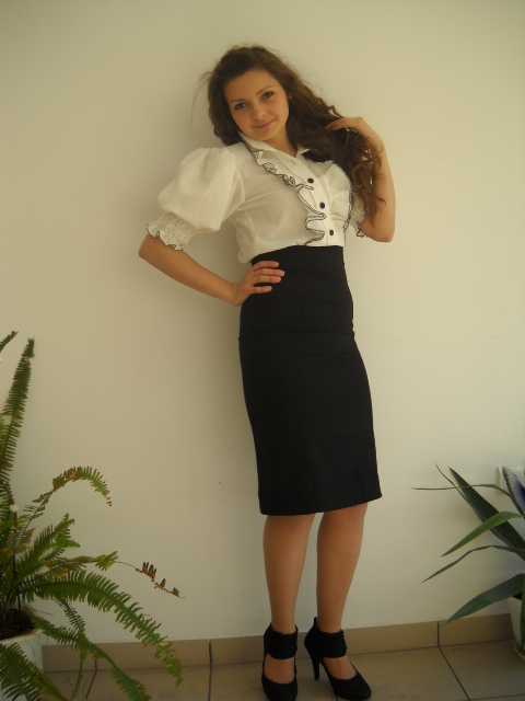 Елегантна дамска униформа – пола с висока талия и риза.