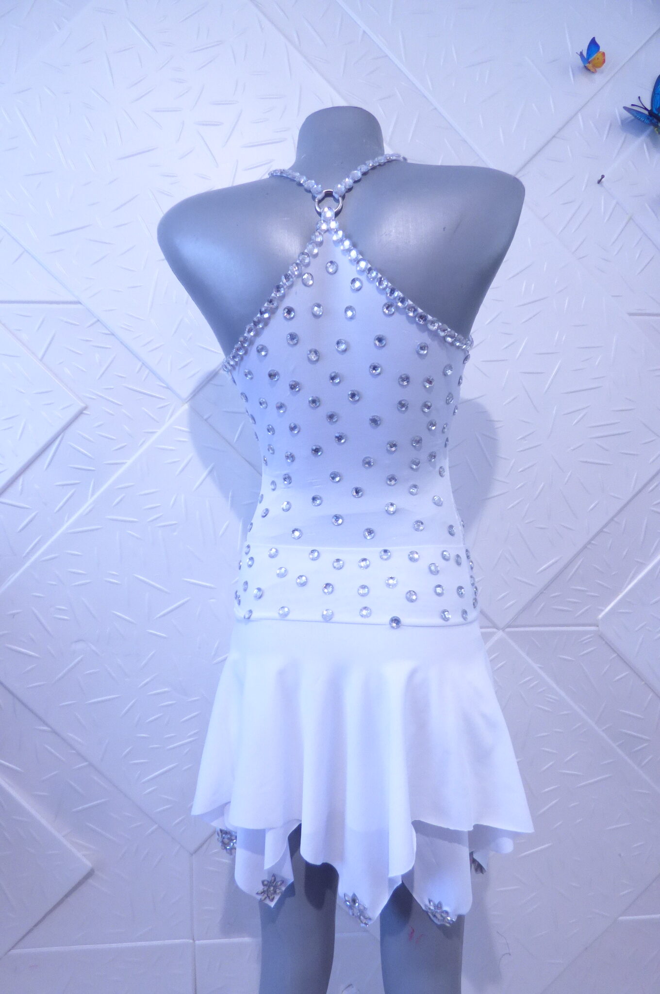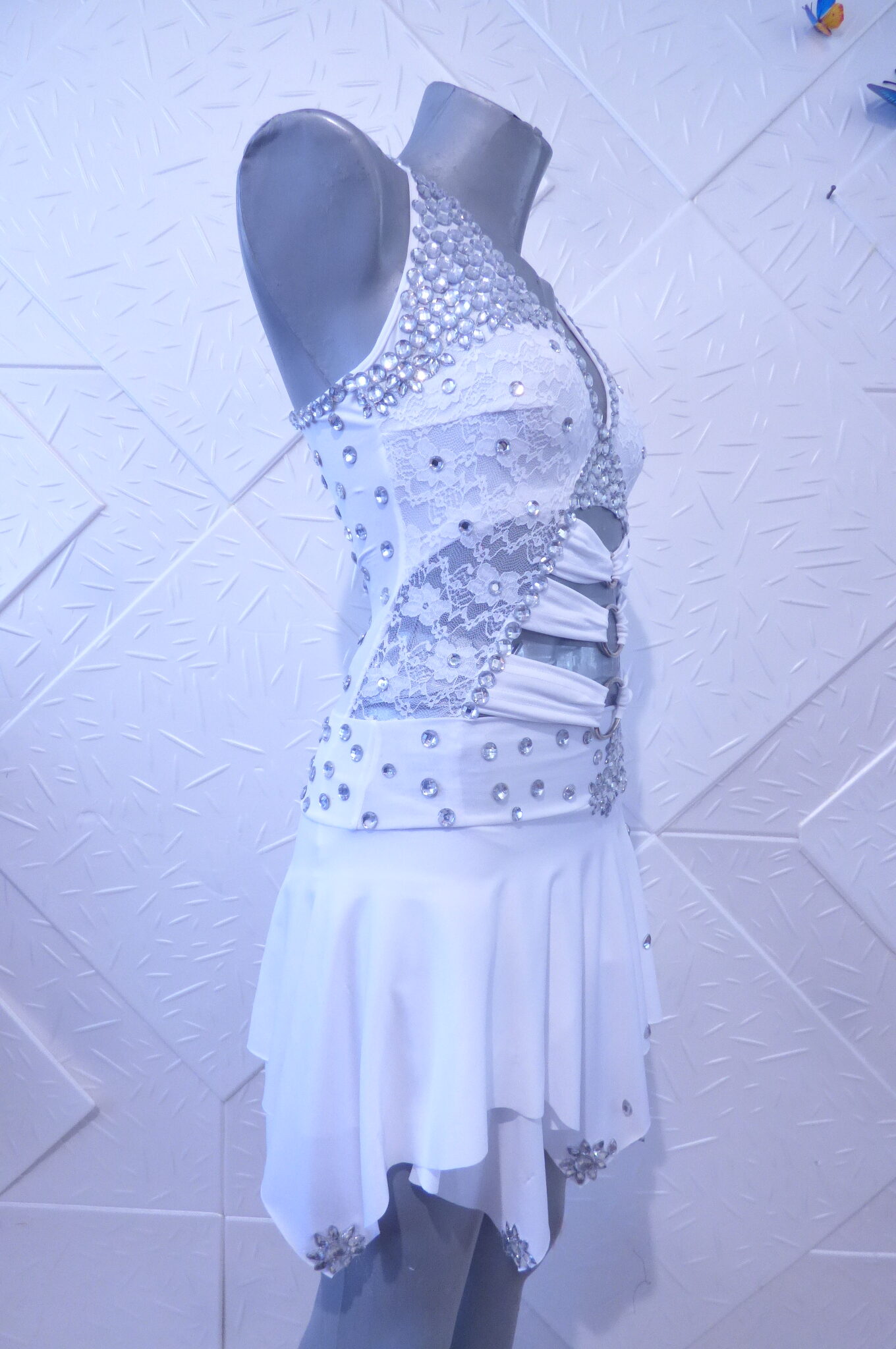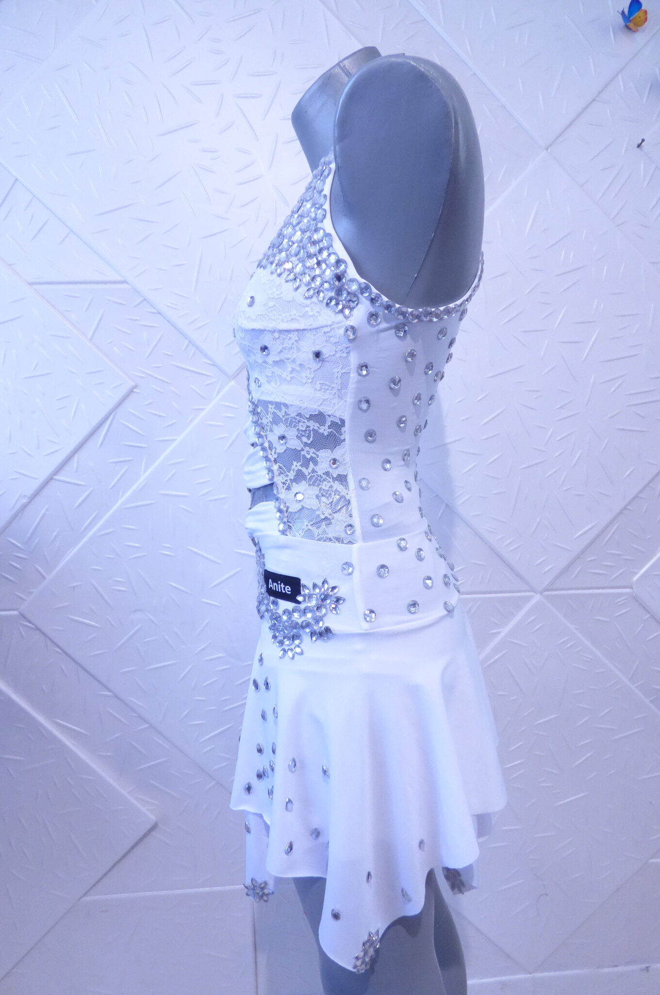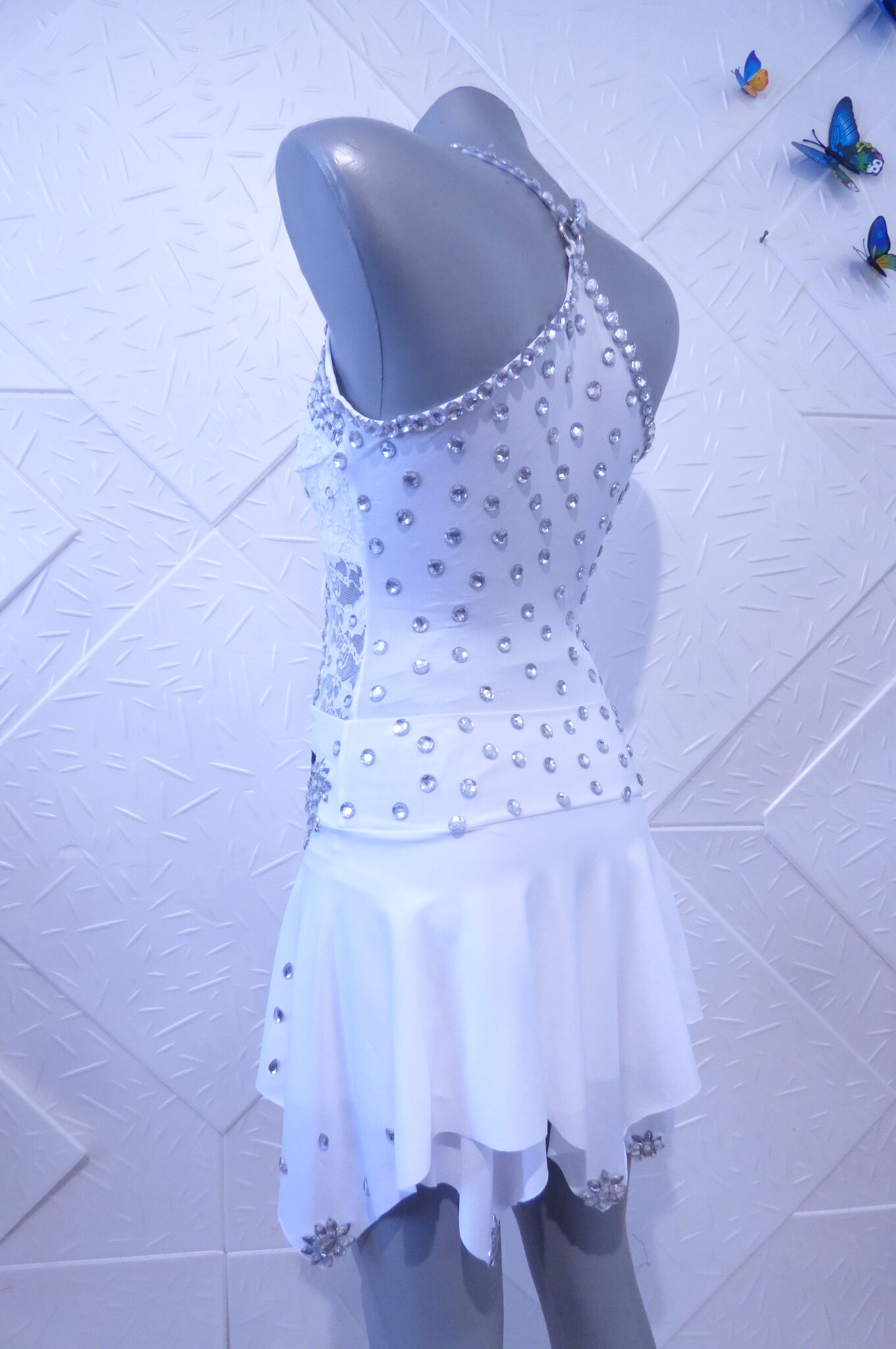 Костюм – боди и пола  за  спортни танци в бяло с  кристали
