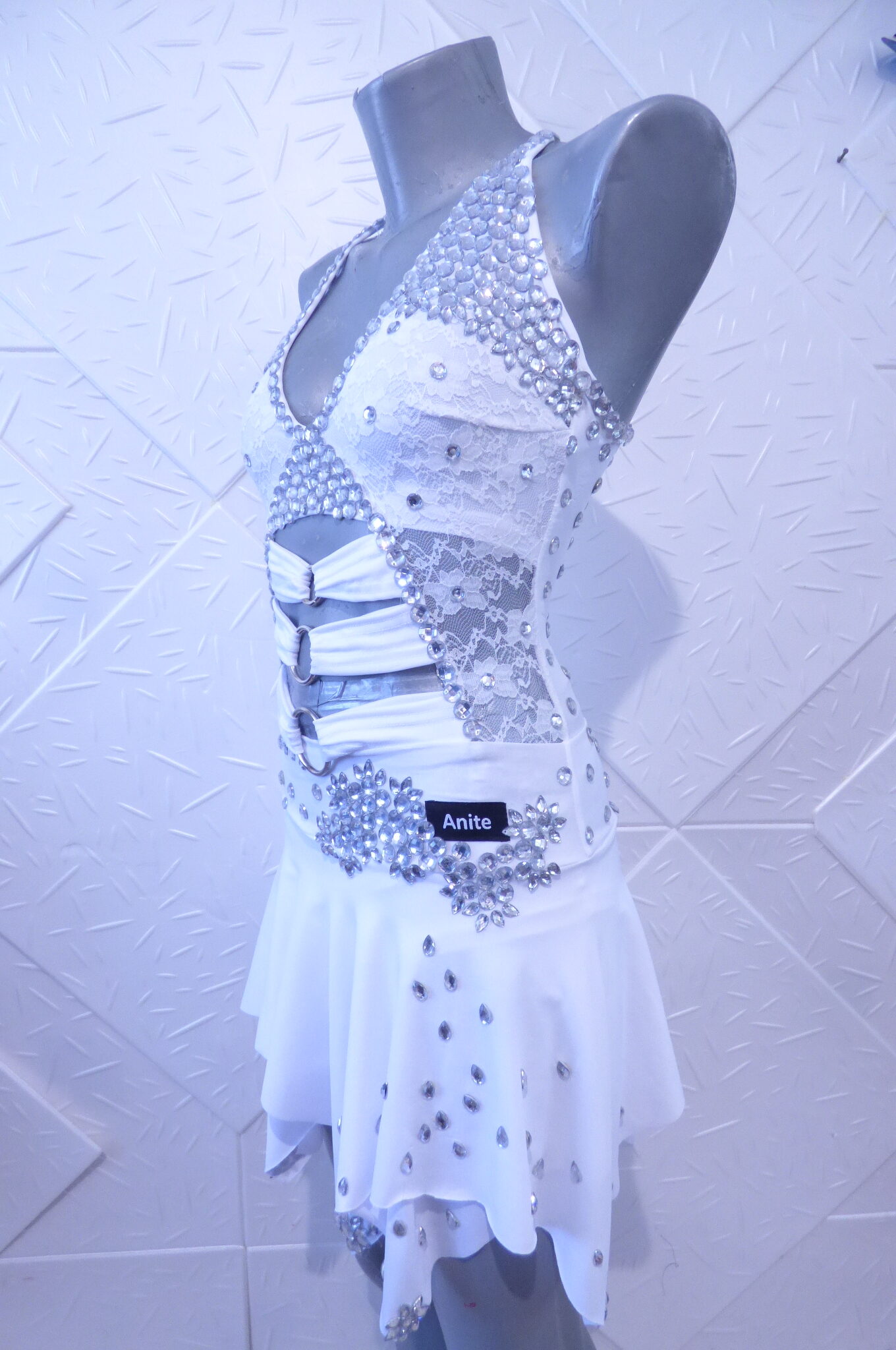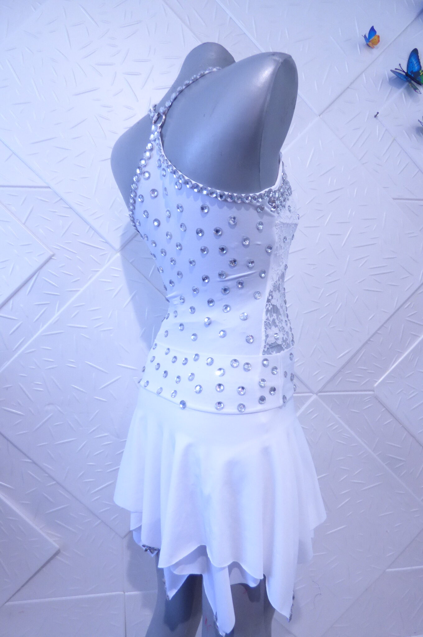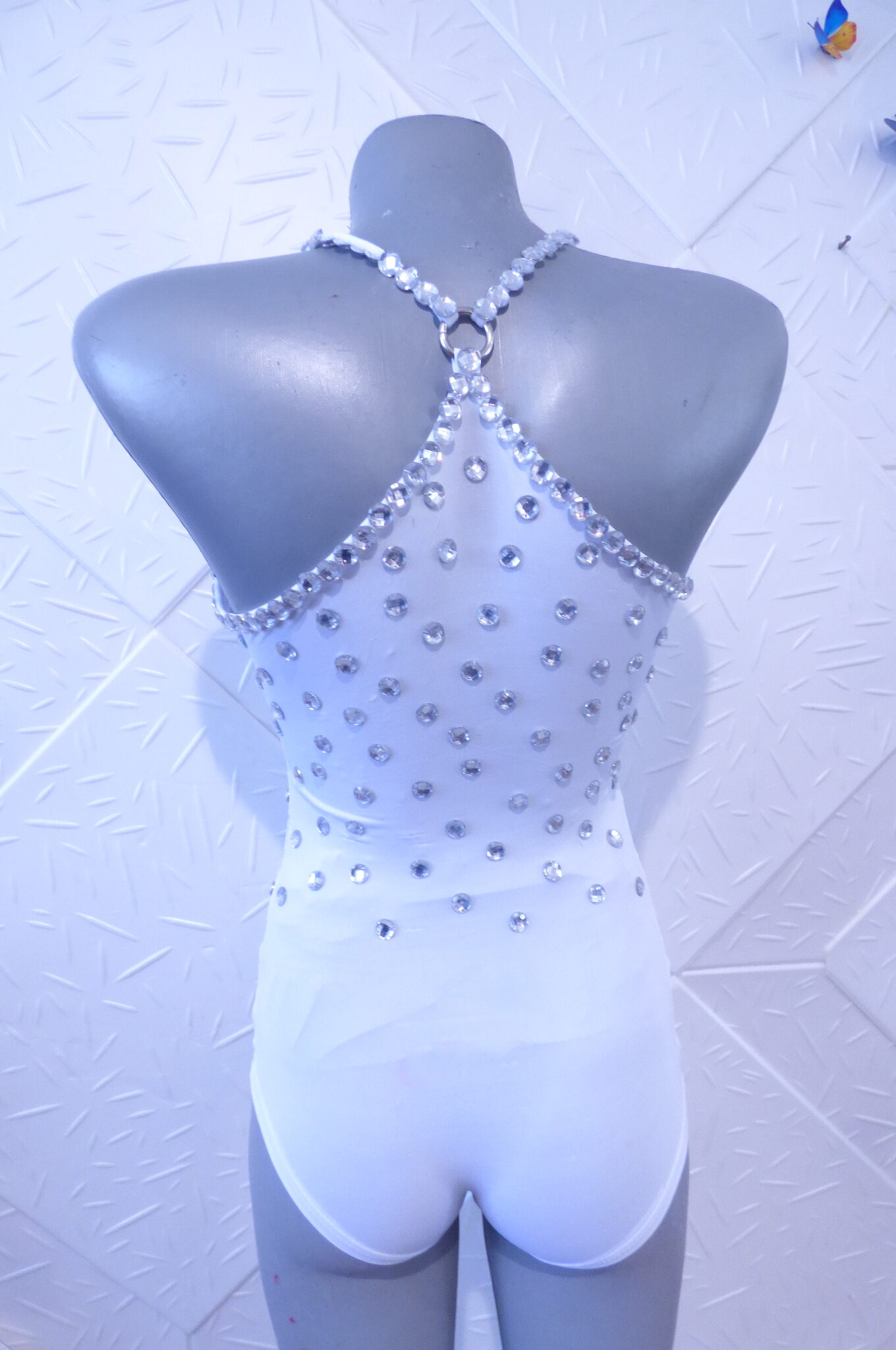 Костюм – боди и пола  за  спортни танци в бяло с  кристали