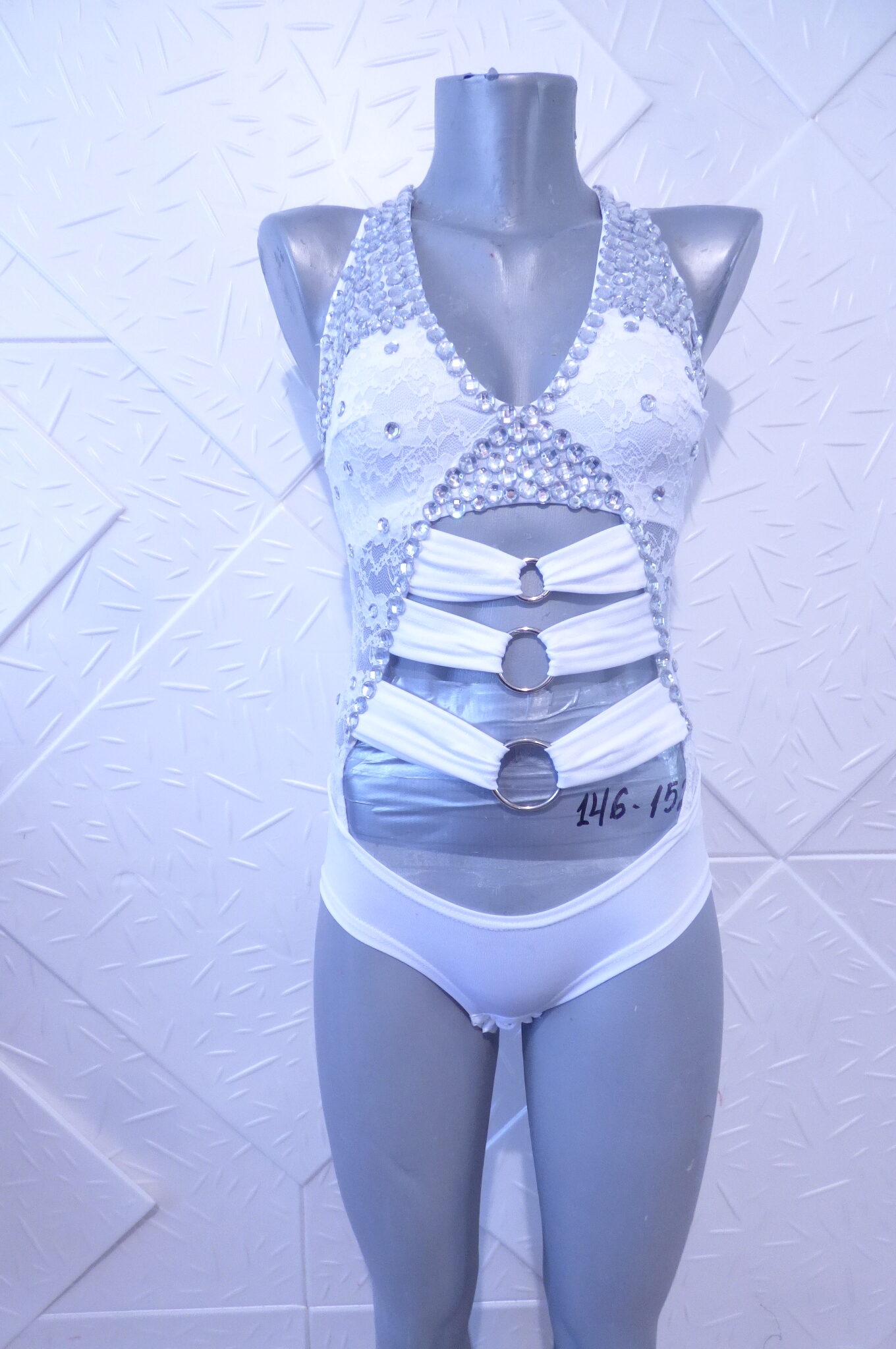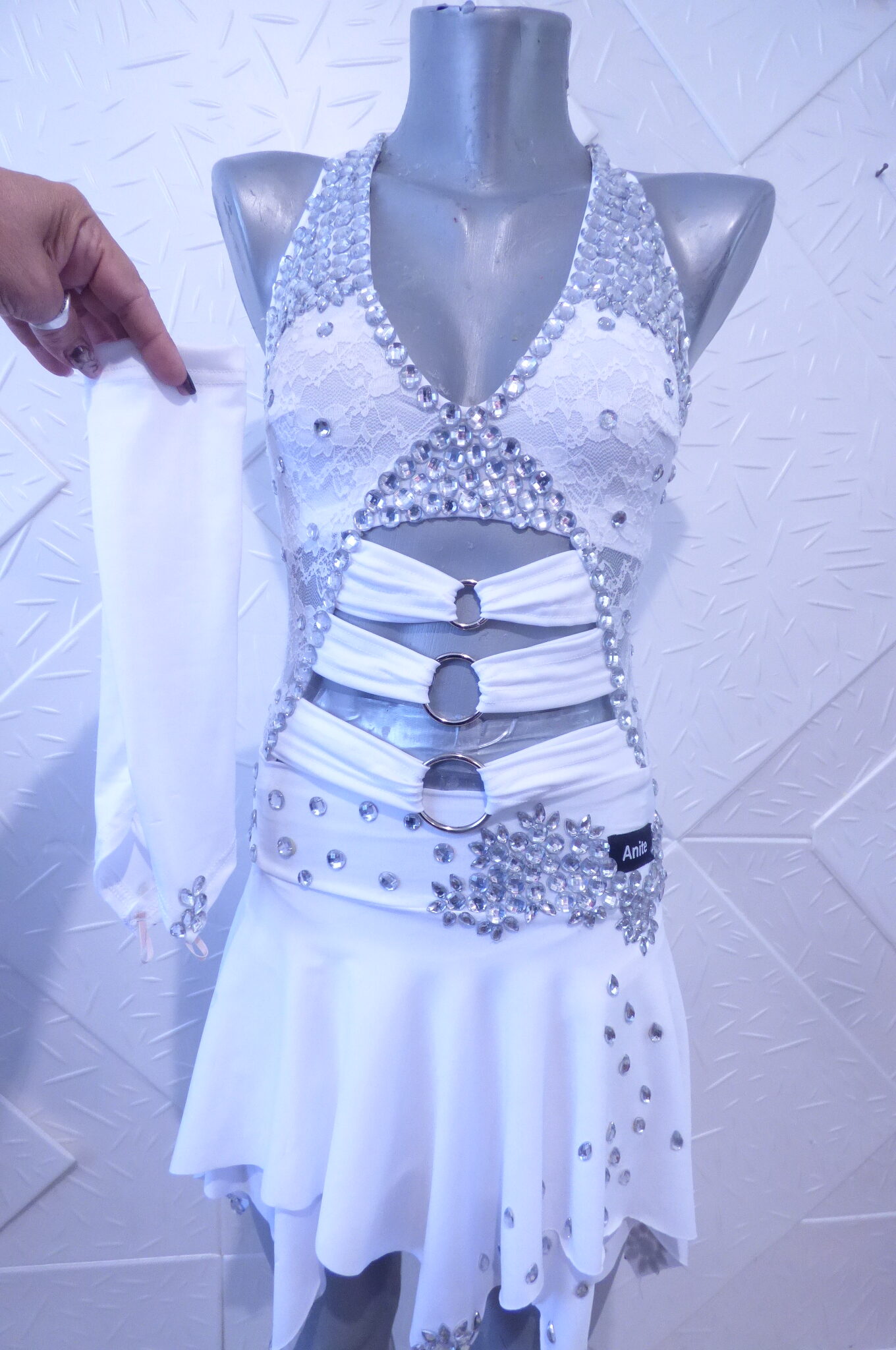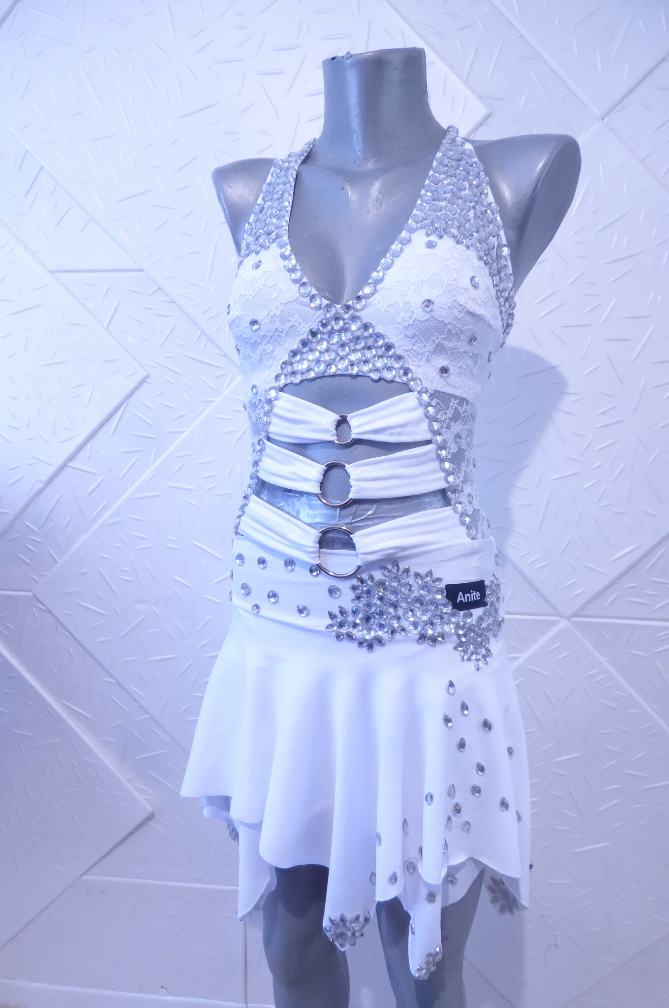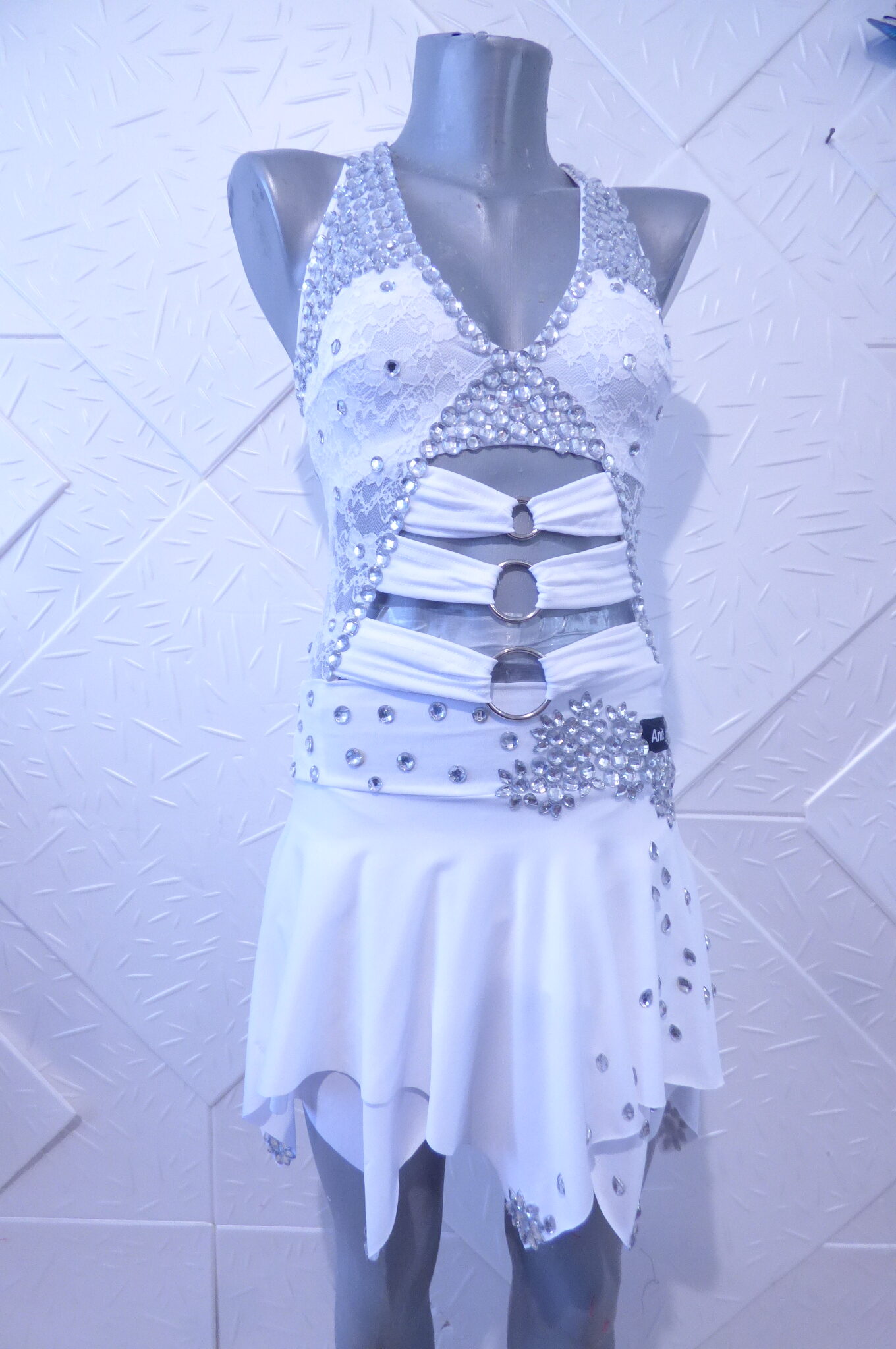 Костюм – боди и пола  за  спортни танци в бяло с  кристали