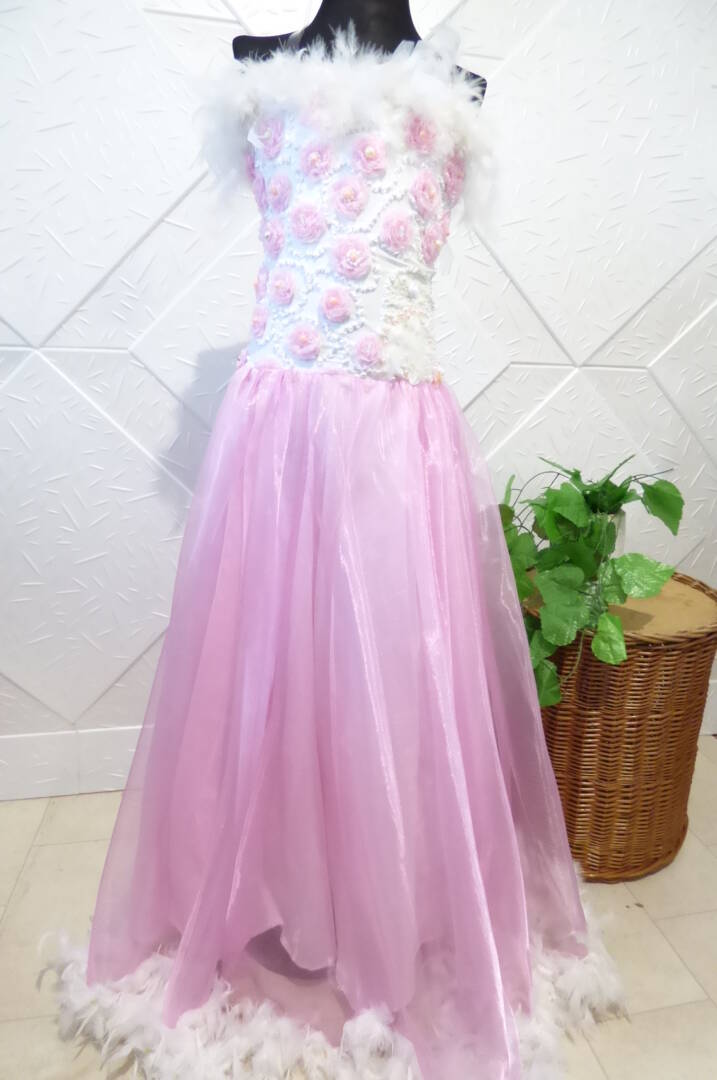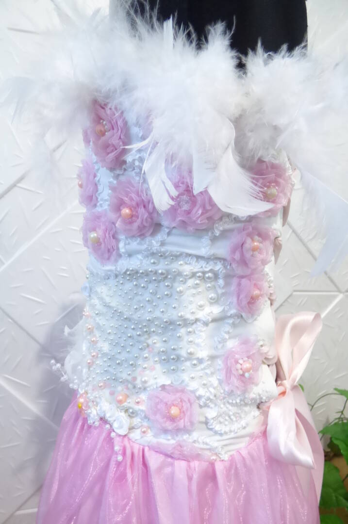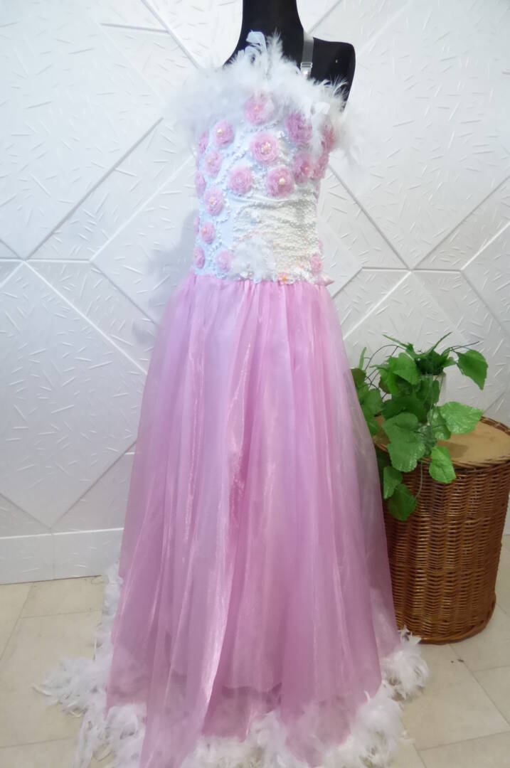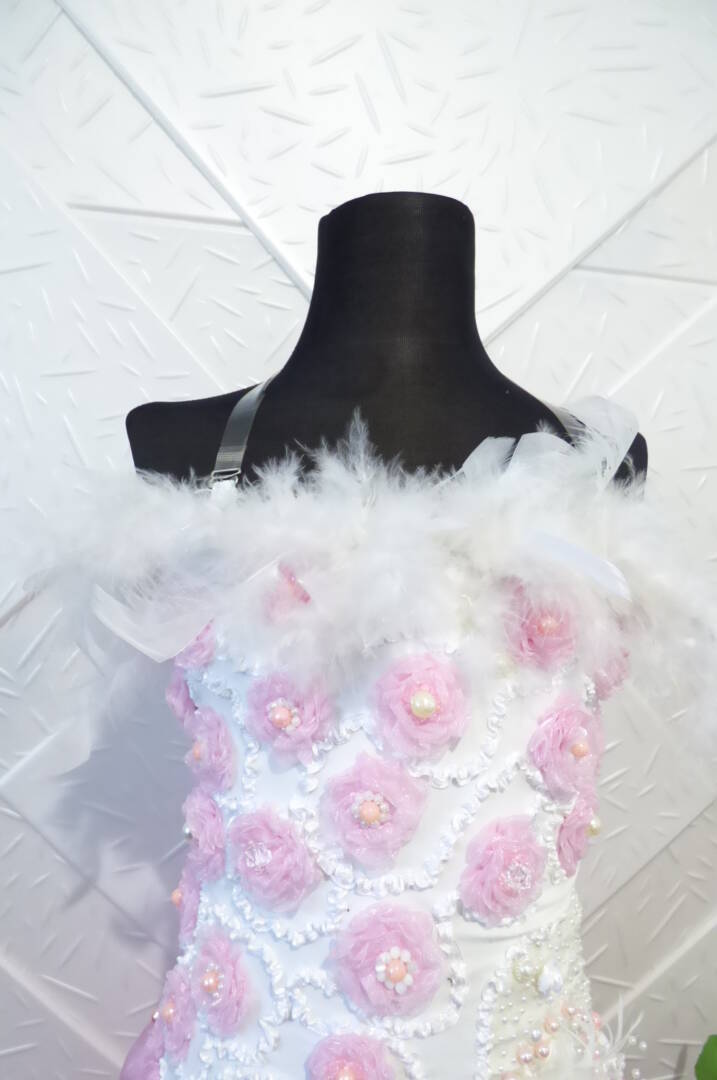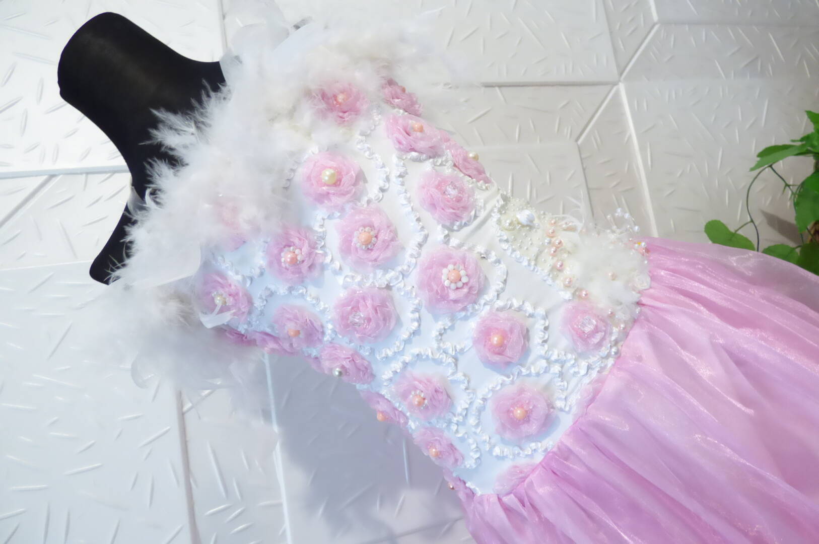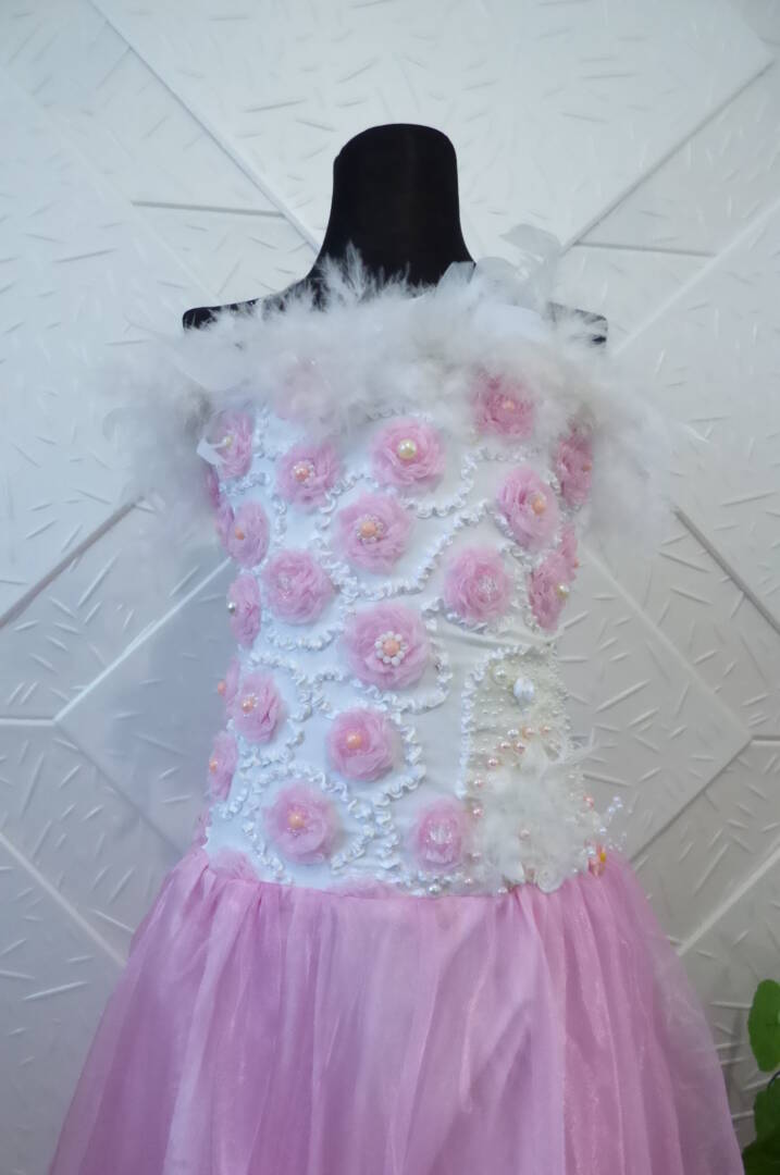 Детска рокля за спортни танци – стандарт или друг повод ,изработена от бял памук с еластан , розова органза, бели пера и мъниста – ръчна изработка.
