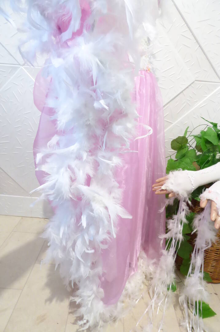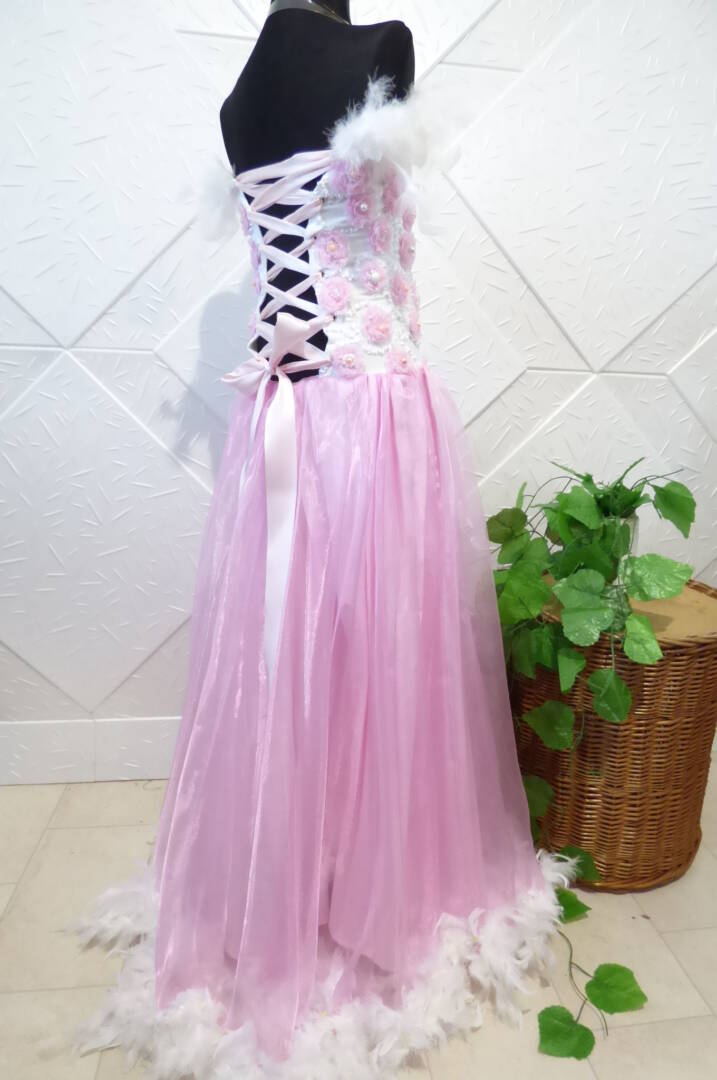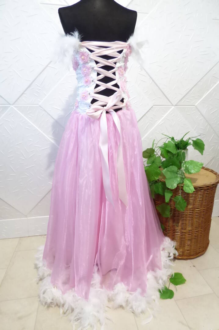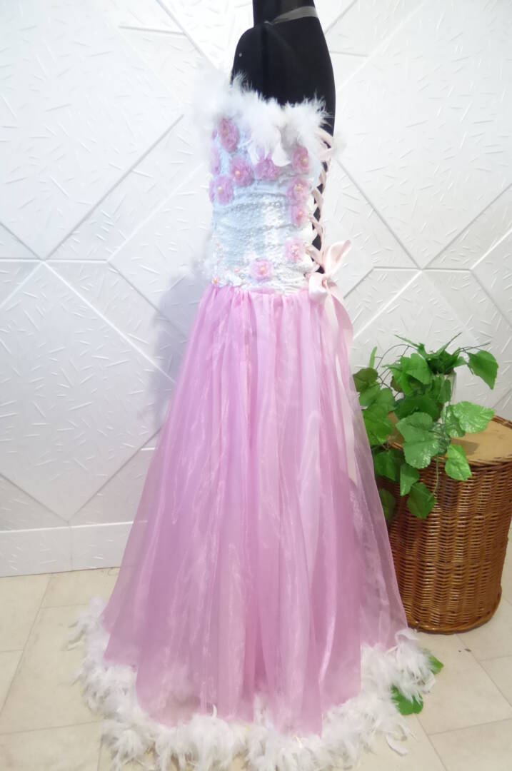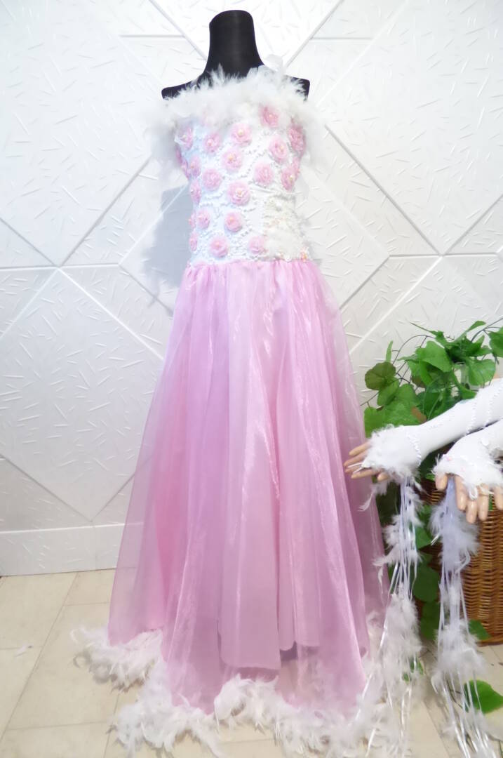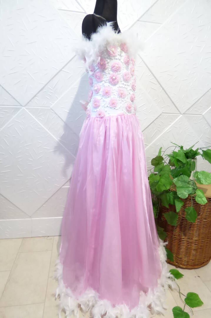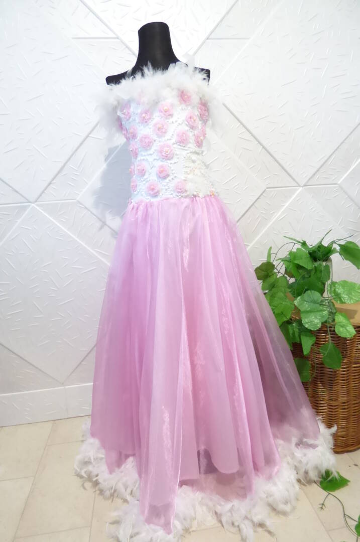 Детска рокля за спортни танци – стандарт или друг повод ,изработена от бял памук с еластан , розова органза, бели пера и мъниста – ръчна изработка.