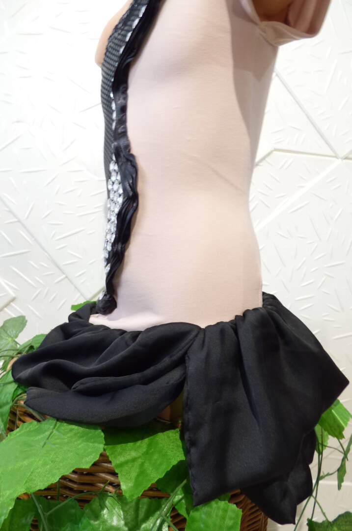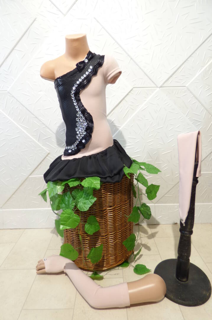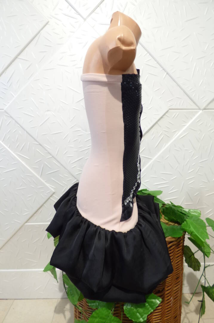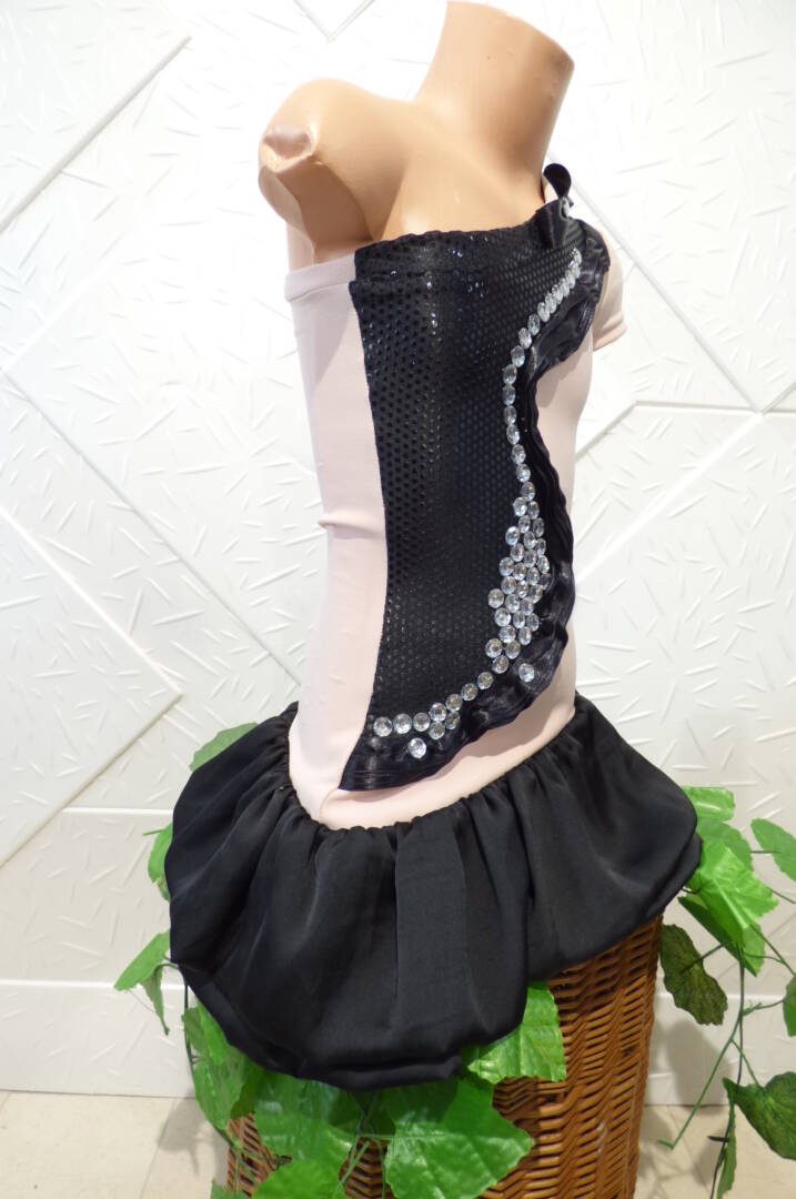 рокля за спортни танци или фигурно пързаляне в розово и черно с ръкавели, изработена от полиамид с еластан , черен текстил и текстил с паети .