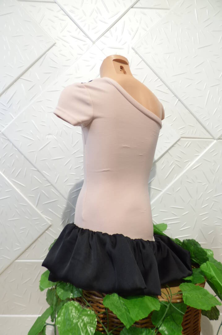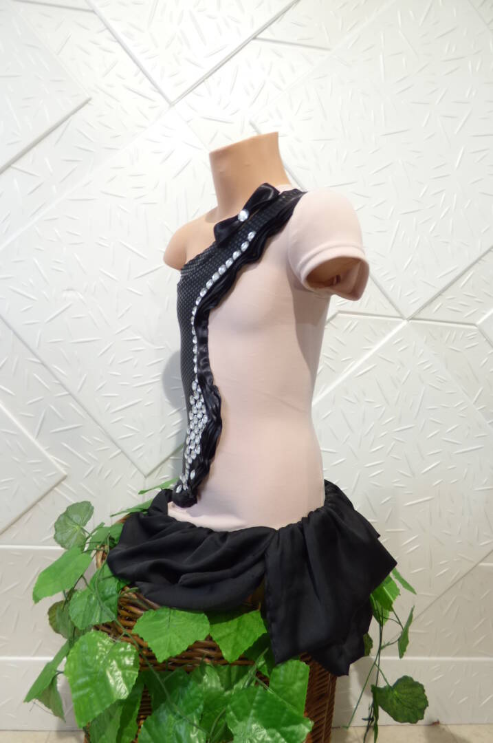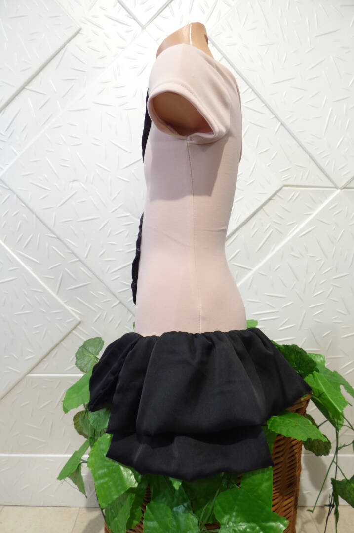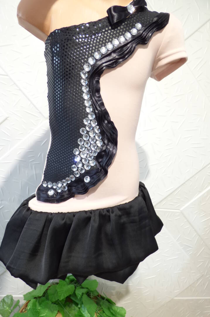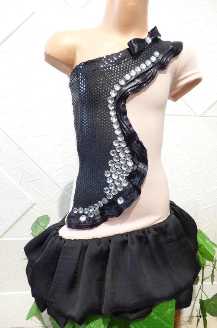 рокля за спортни танци или фигурно пързаляне в розово и черно с ръкавели, изработена от полиамид с еластан , черен текстил и текстил с паети .