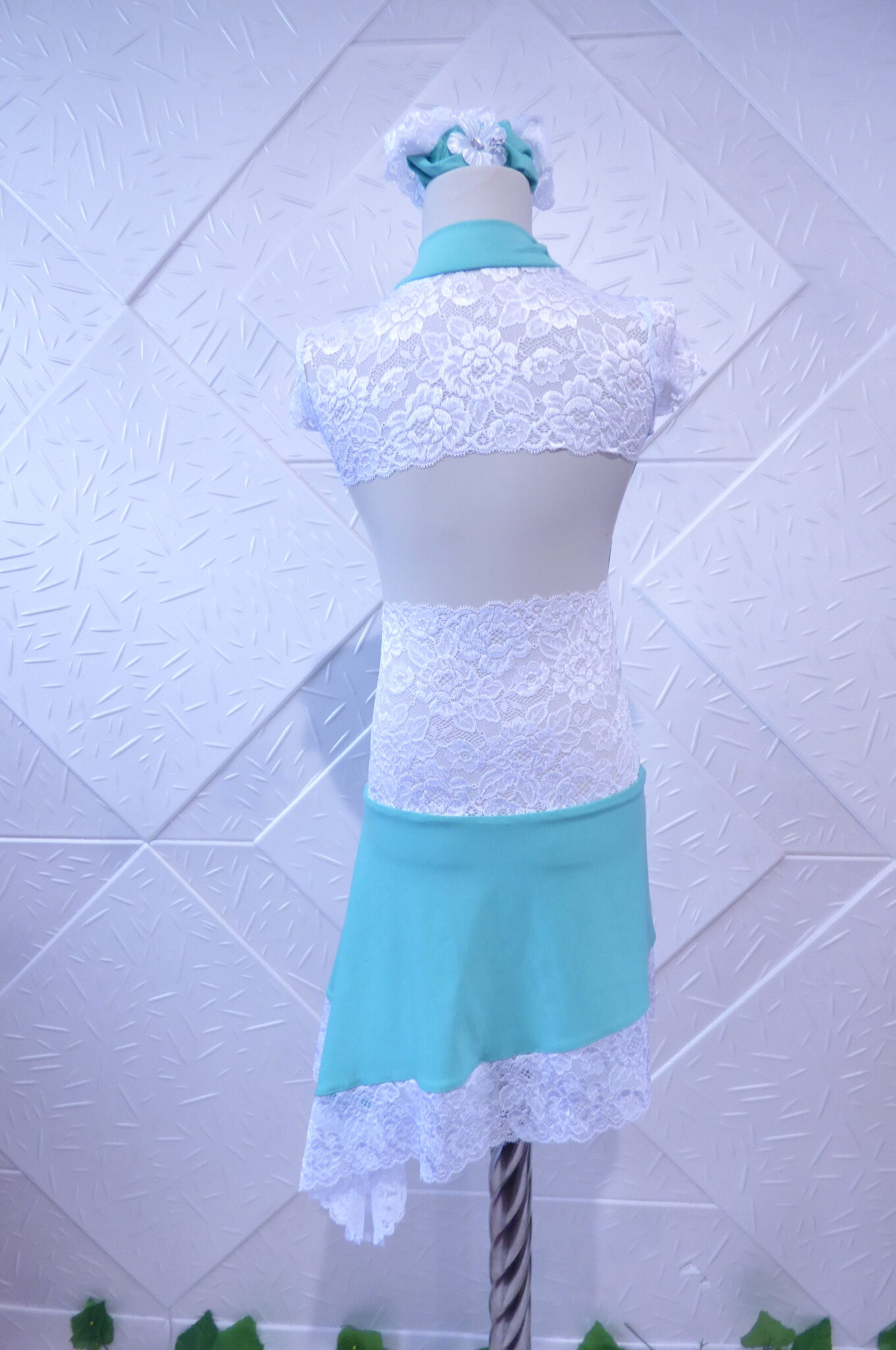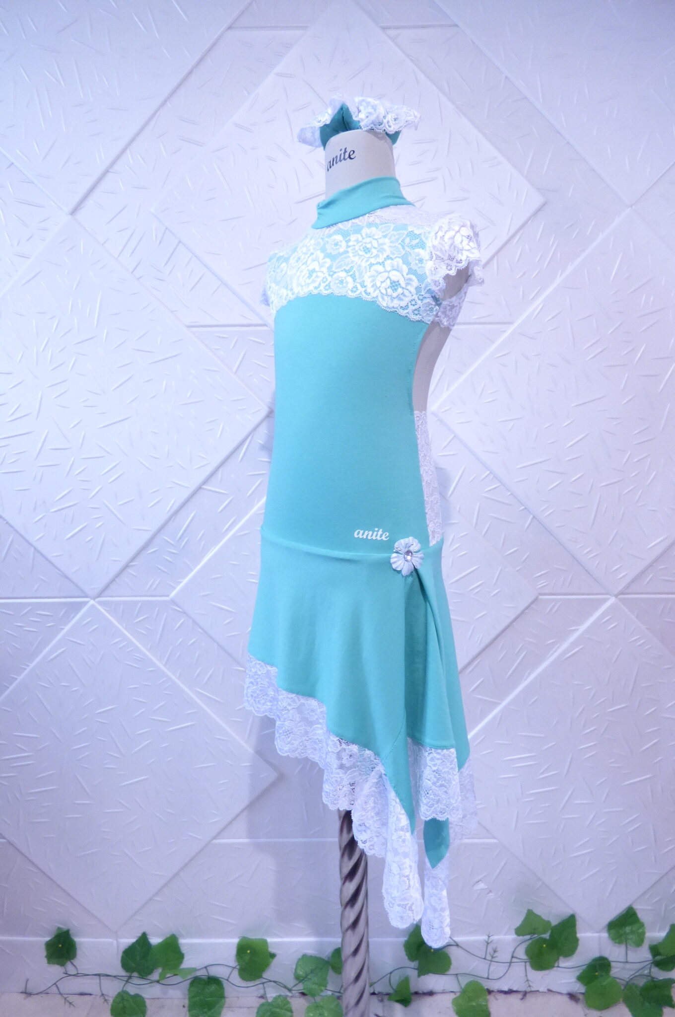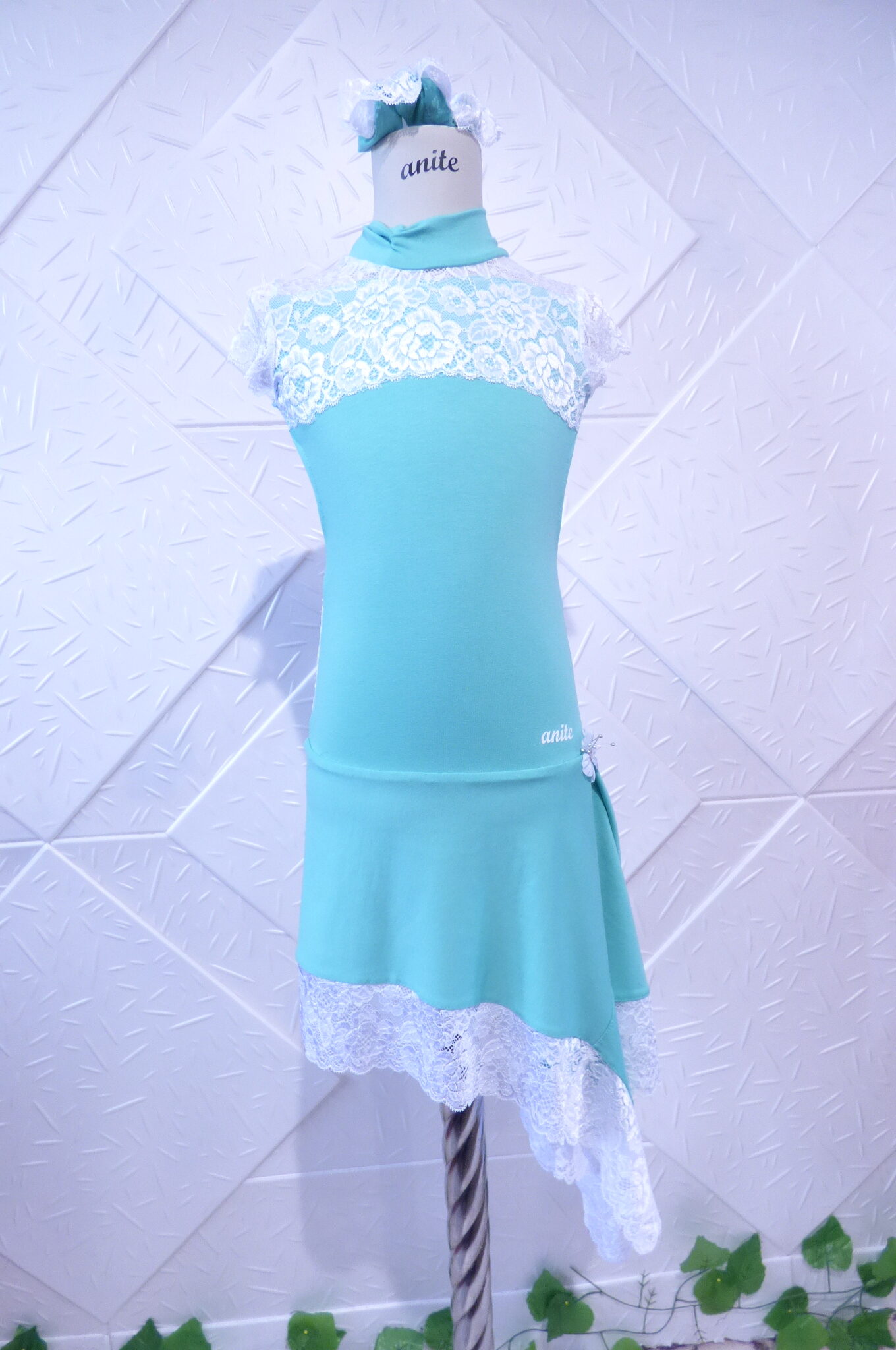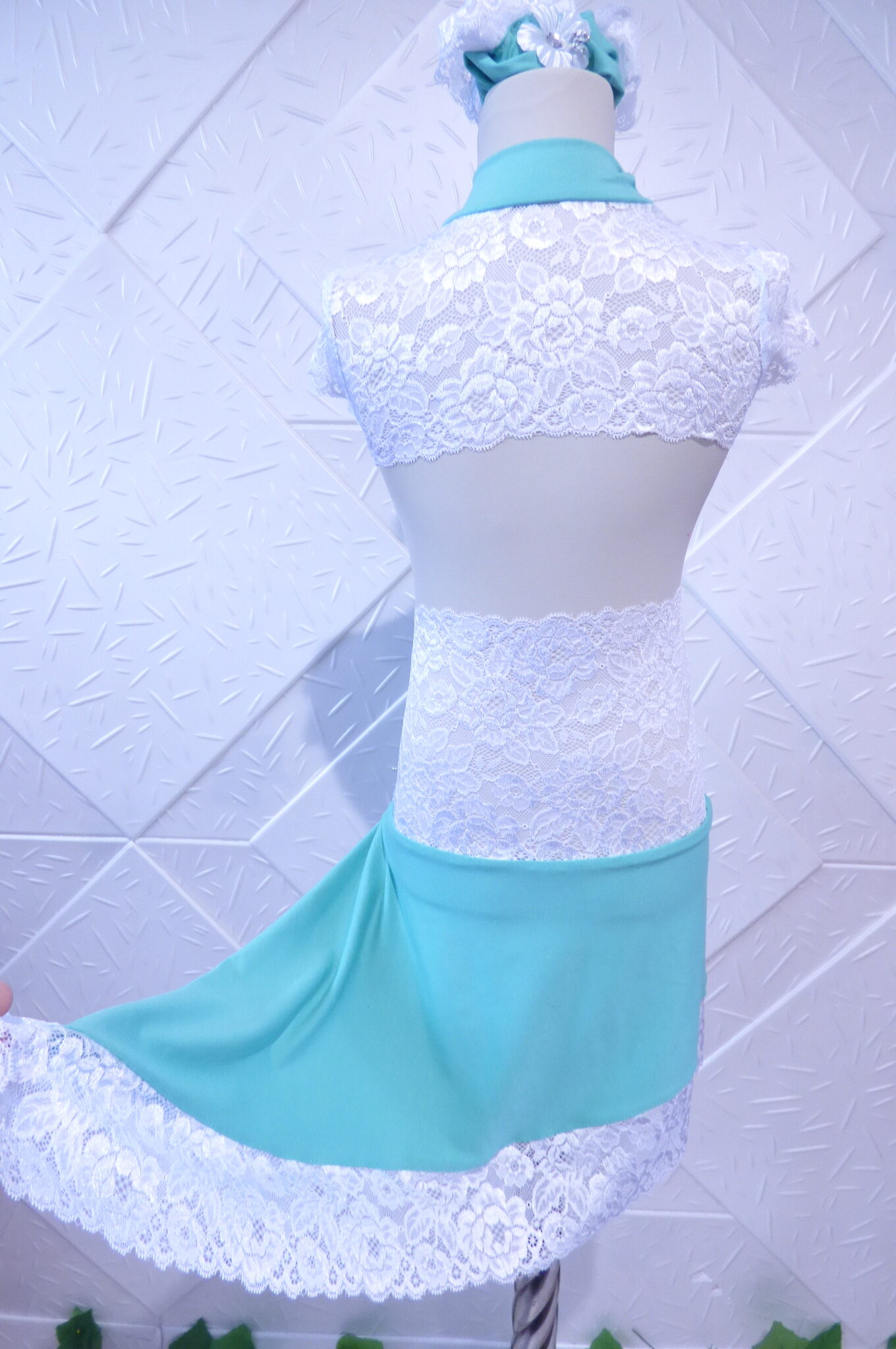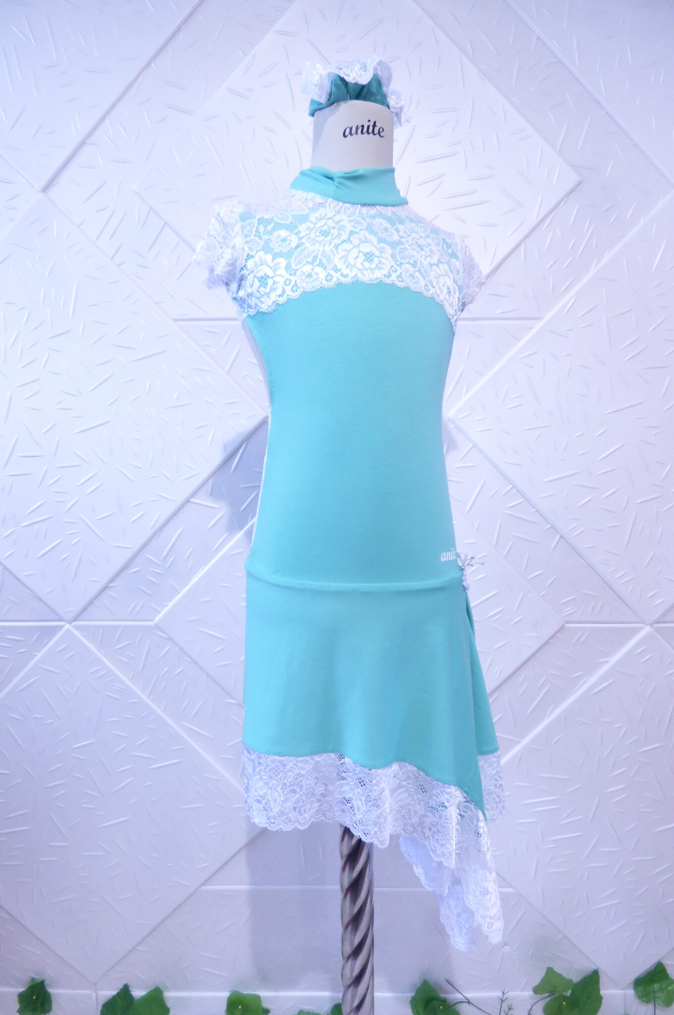 Рокля за спортни танци в цвят мента с бяла дантела, изработена от памук с ликра и дантела с еластан .