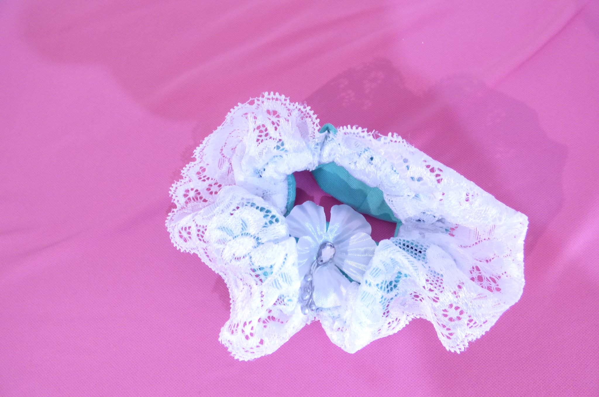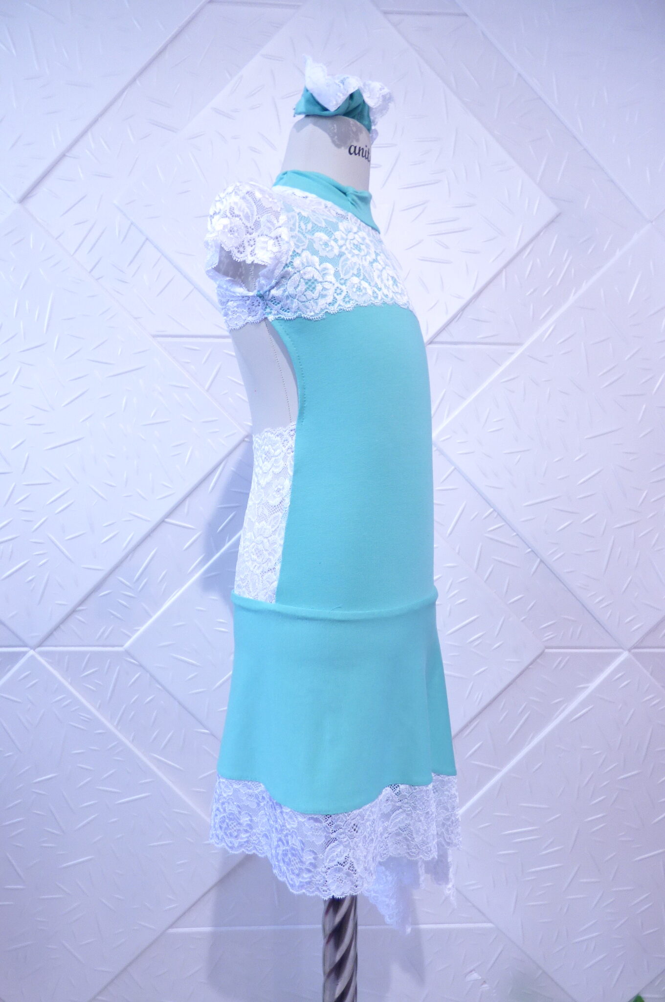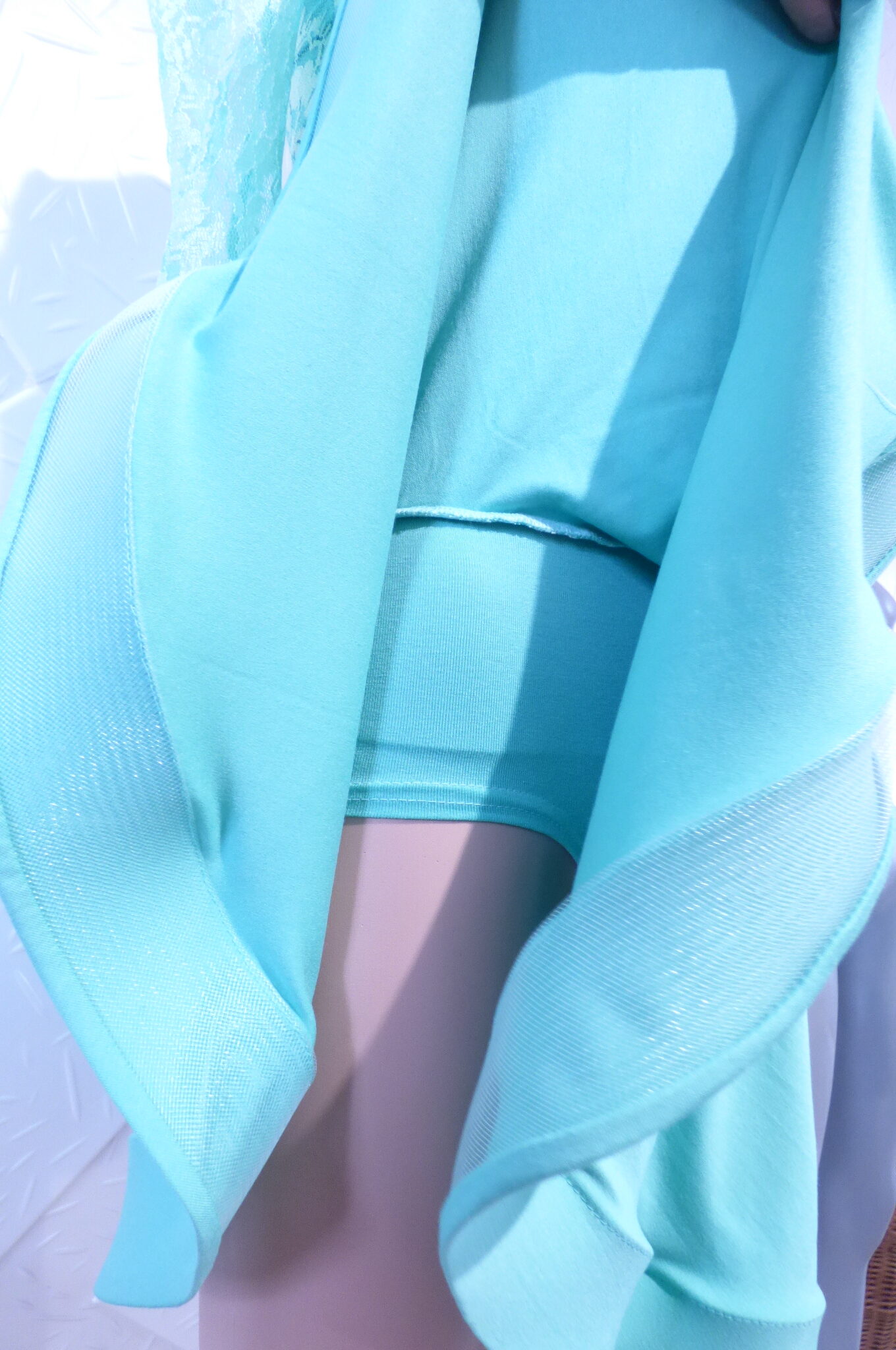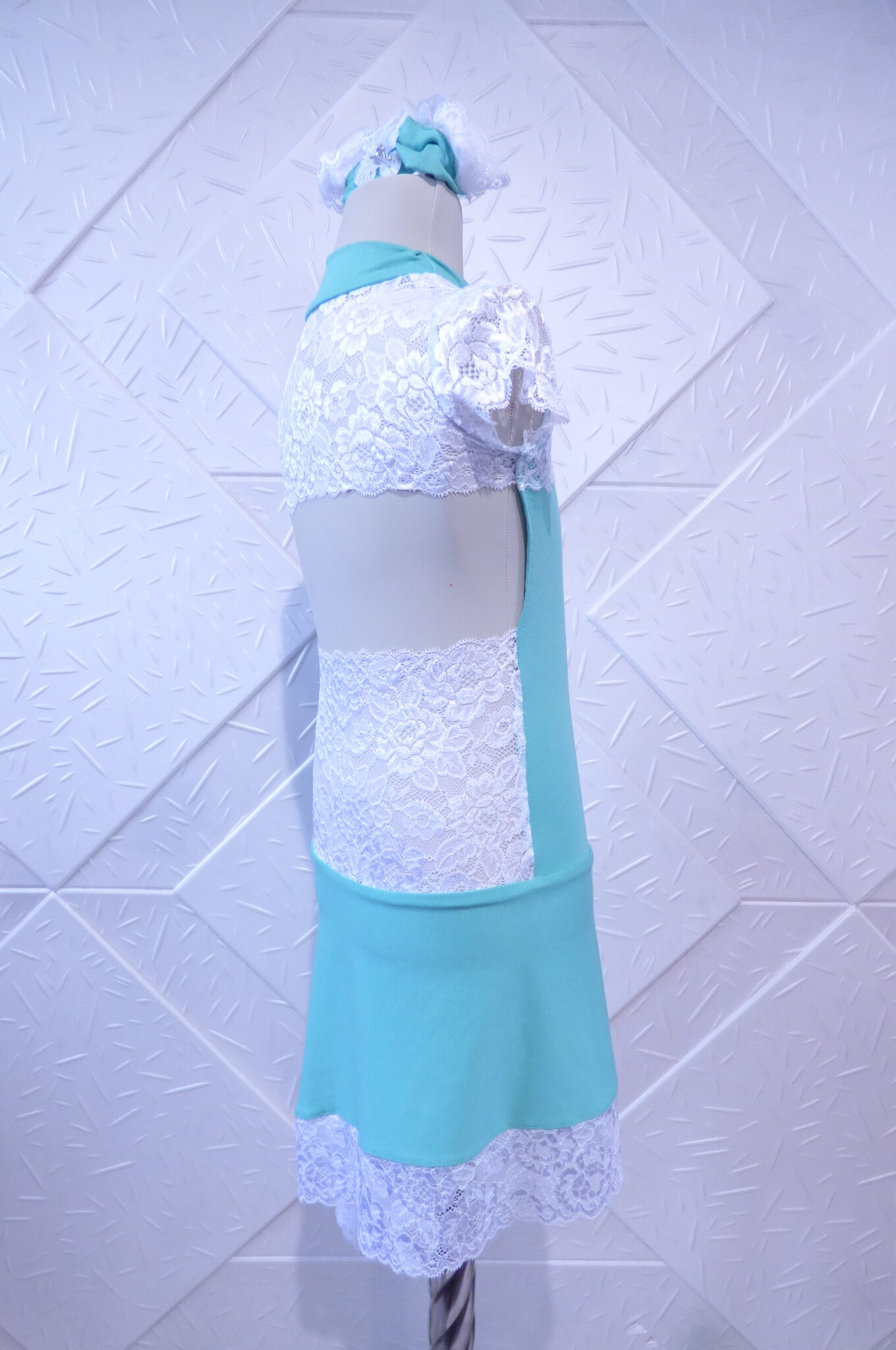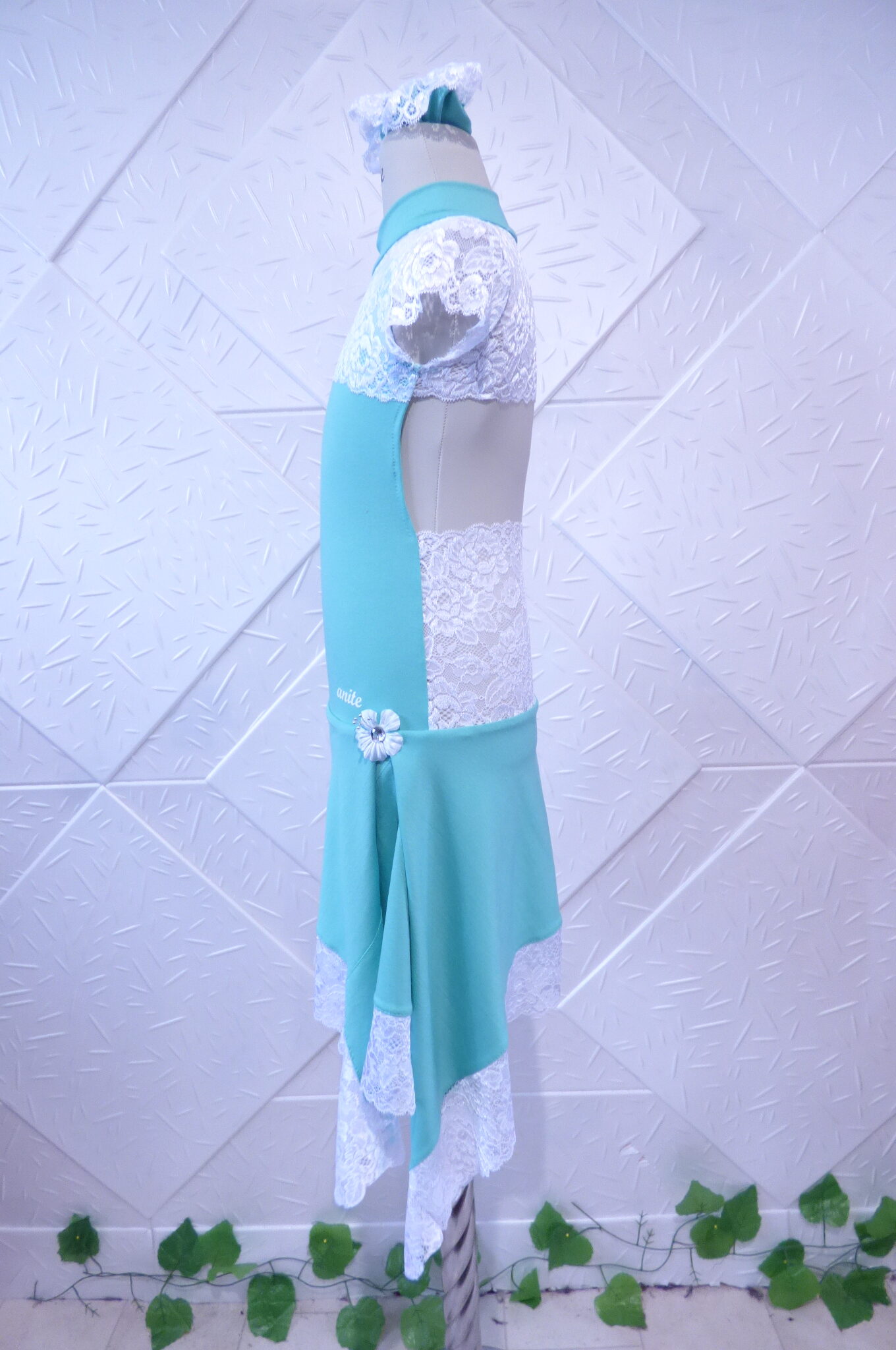 Рокля за спортни танци в цвят мента с бяла дантела, изработена от памук с ликра и дантела с еластан .