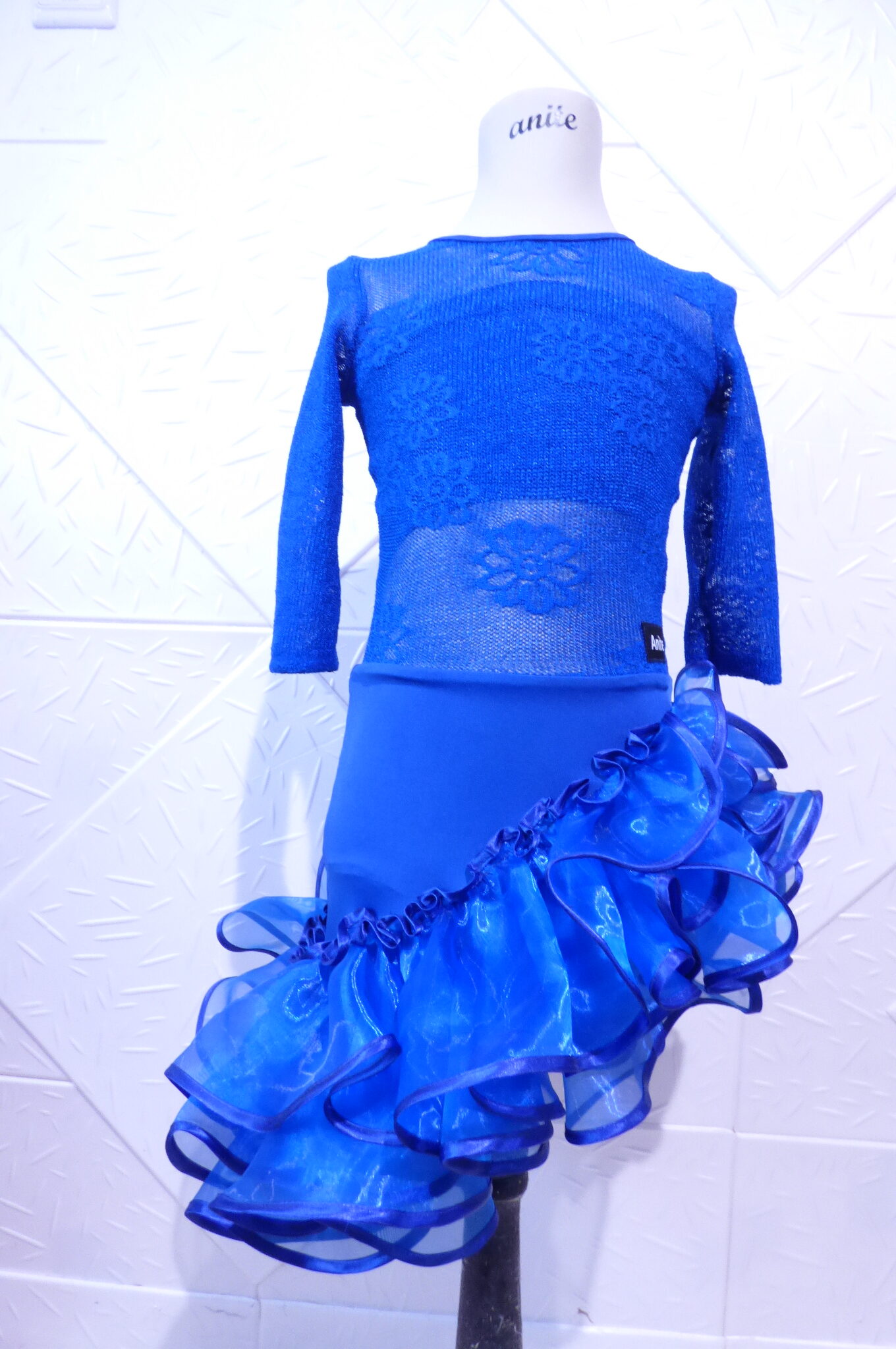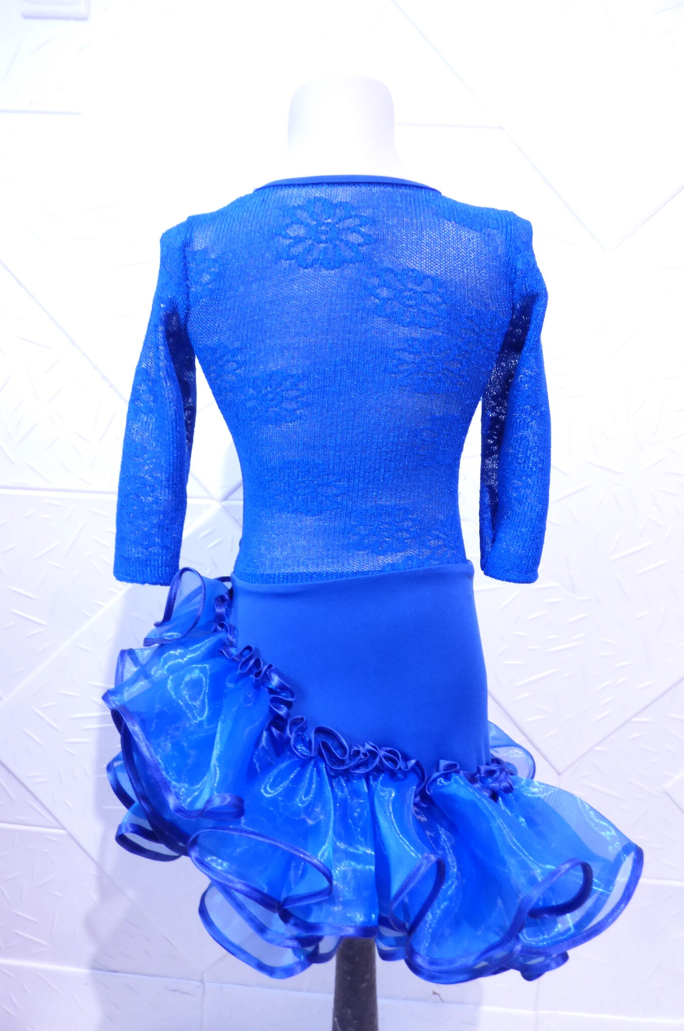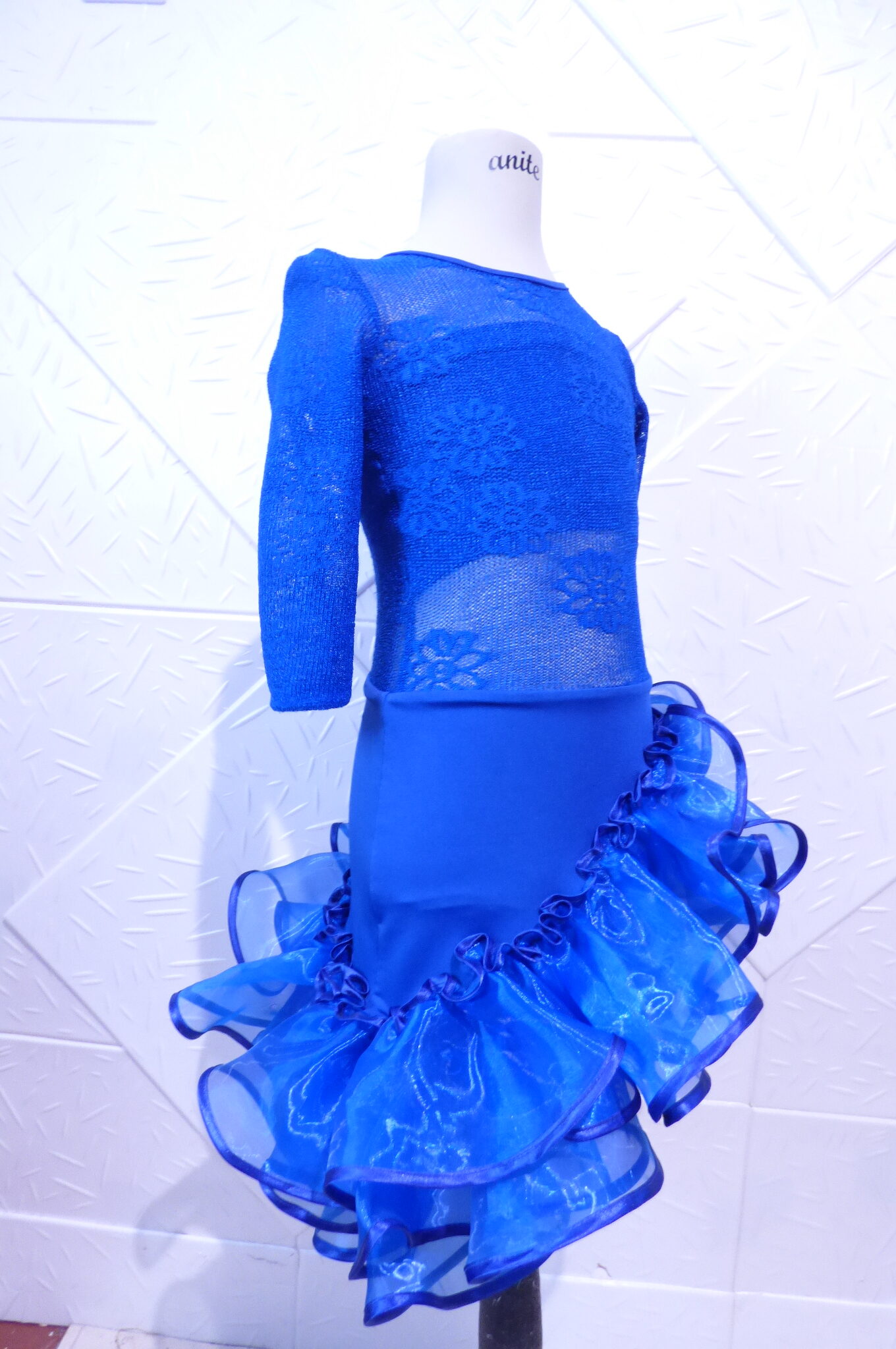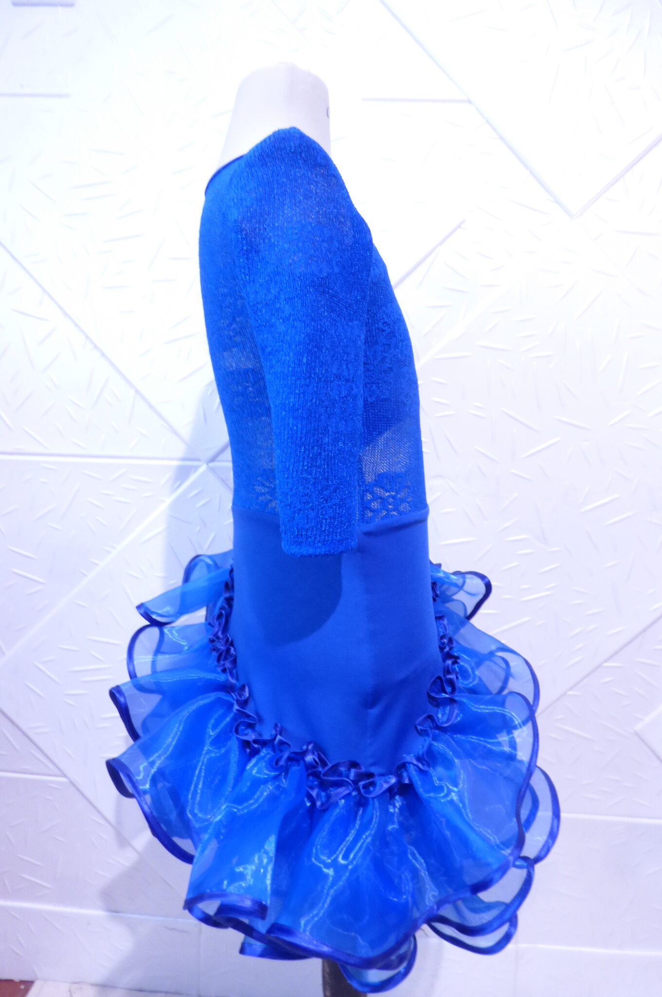 Синя рокля за спортни танци с дантела и органза.модела е подходящ за дете с размери от -128 см.до 140см. височина на детето .