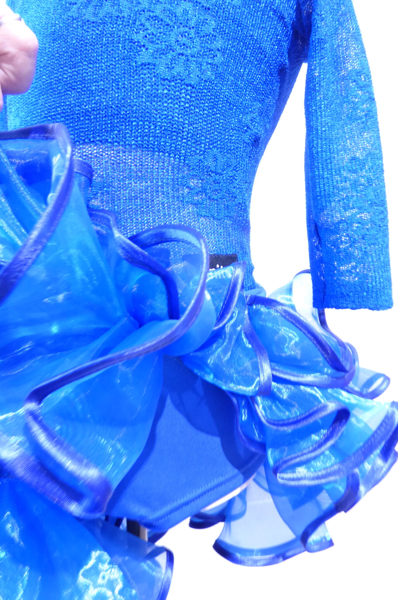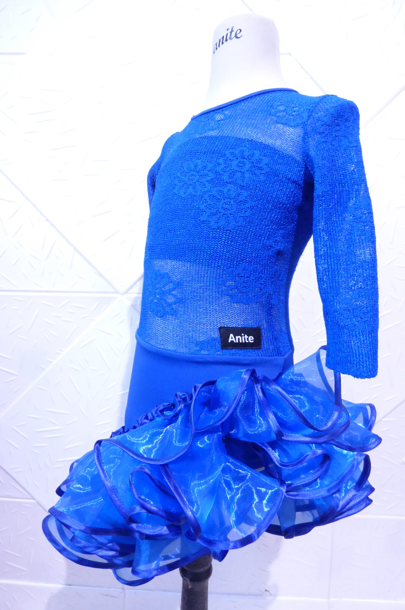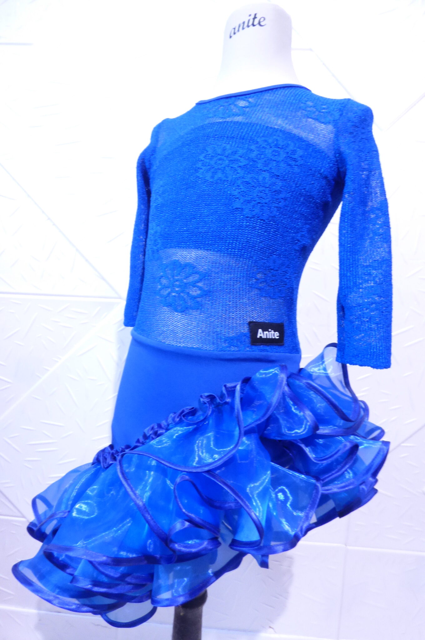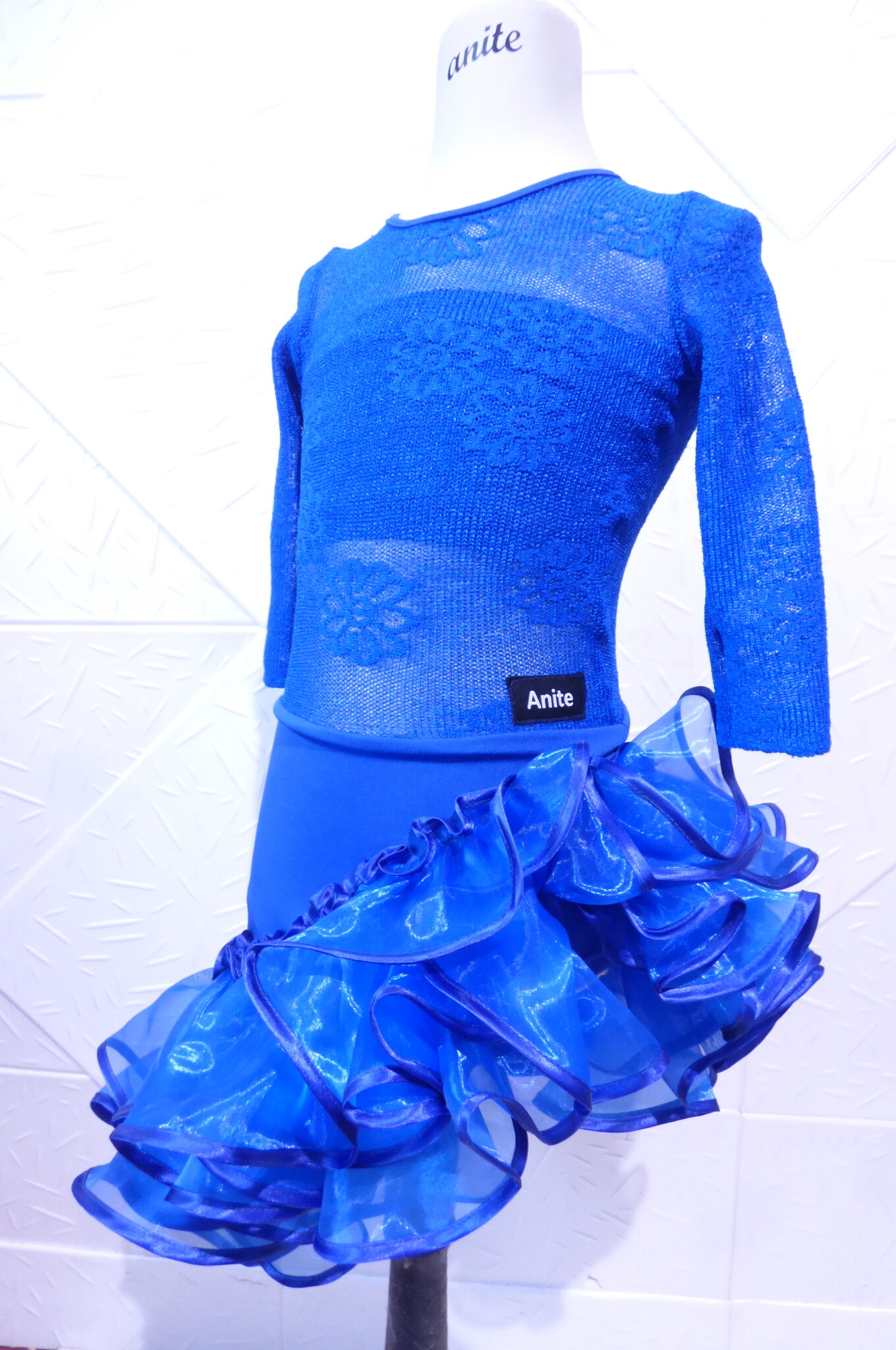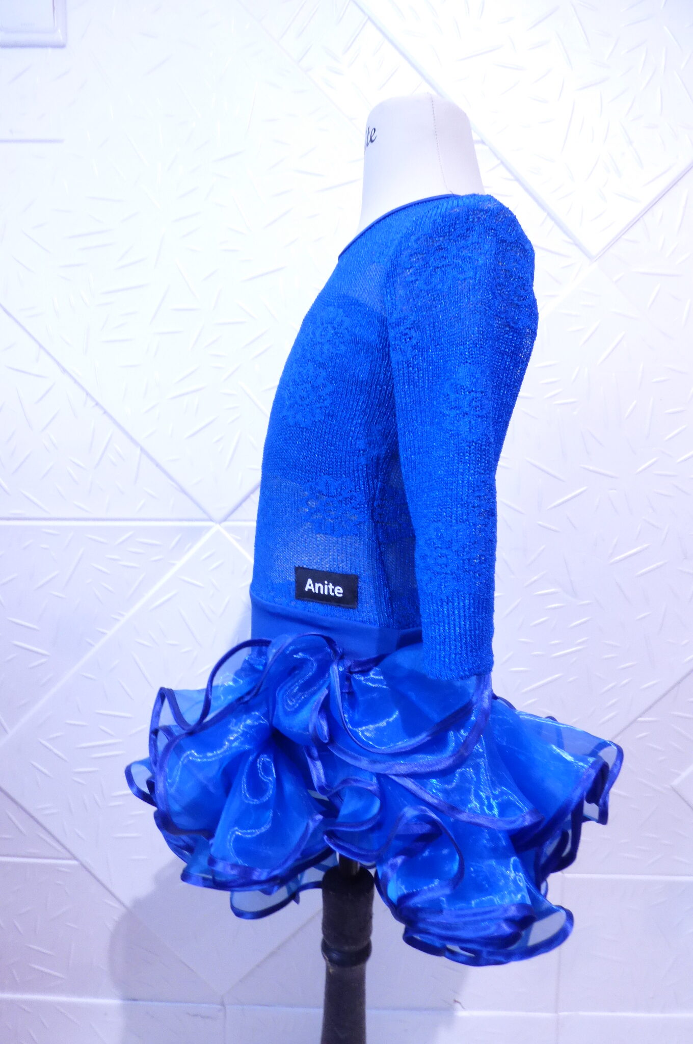 Синя рокля за спортни танци с дантела и органза.модела е подходящ за дете с размери от -128 см.до 140см. височина на детето .